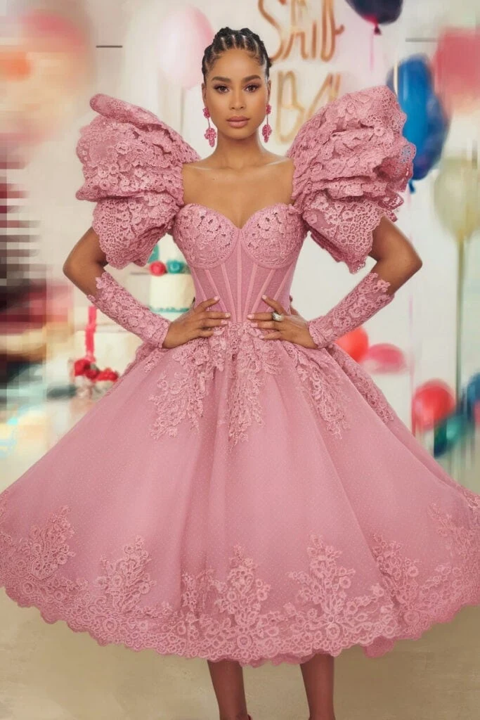The dramatic puffed sleeves add a touch of whimsy and elegance, while the sweetheart neckline flatters the dcolletage. The tea-length hem allows for easy movement and showcases your favorite party shoes.