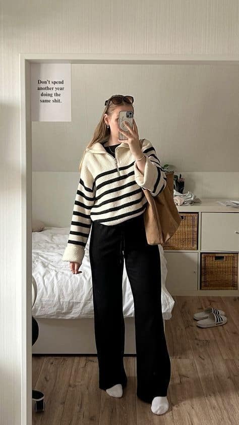 This effortlessly stylish ensemble combines comfort and sophistication, perfect for making a statement on campus. The cream and black striped half-zip sweater adds a touch of nautical charm while providing warmth for cooler fall days.