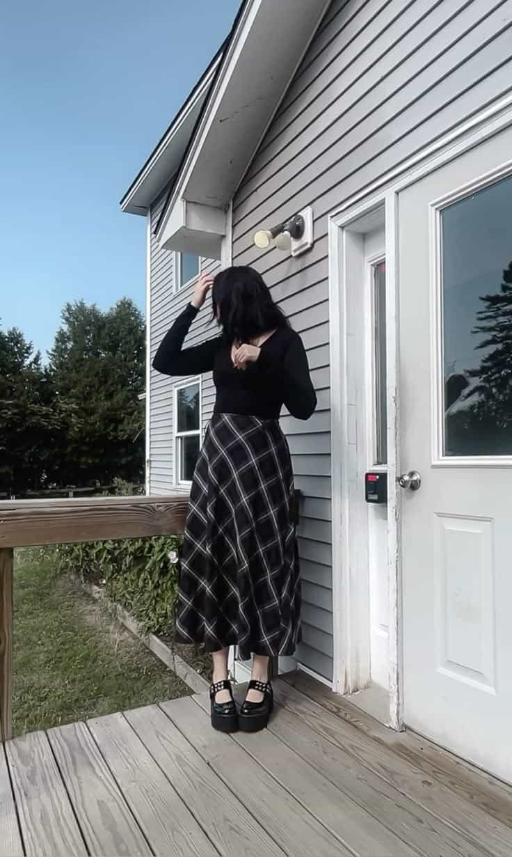 This outfit seamlessly blends classic and edgy elements for a striking back-to-school look. The long plaid skirt in black and white creates a timeless foundation, while the fitted black top adds a sleek silhouette.