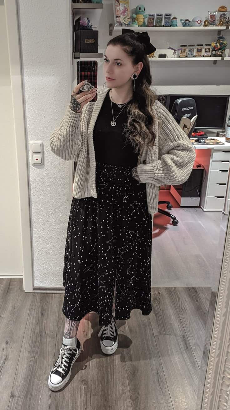 This ensemble perfectly balances style and comfort for those crisp fall days on campus. The star of the outfit is the black constellation-print maxi skirt, adding a touch of whimsy to the look.