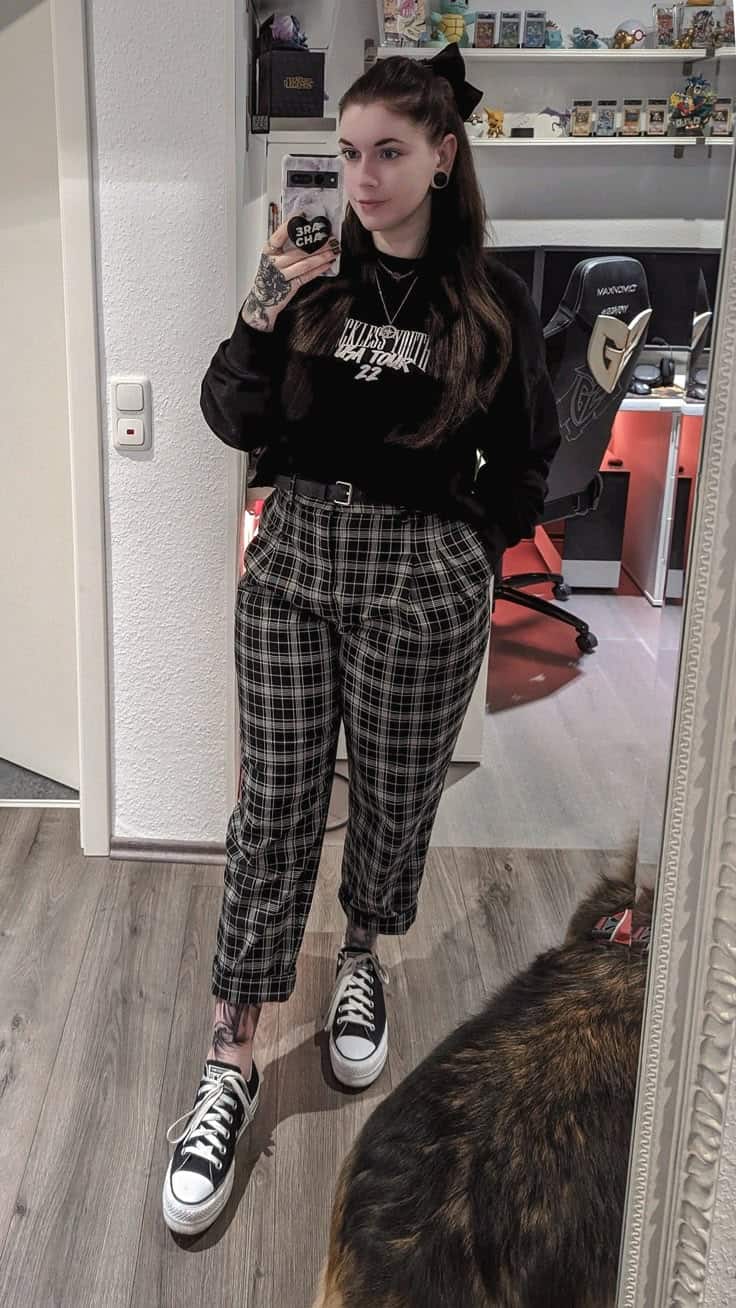 This outfit perfectly embodies the stylish black back-to-school aesthetic while adding a touch of edgy flair. The ensemble features a black graphic sweatshirt paired with eye-catching plaid trousers, creating a bold contrast that’s sure to turn heads in the hallways.