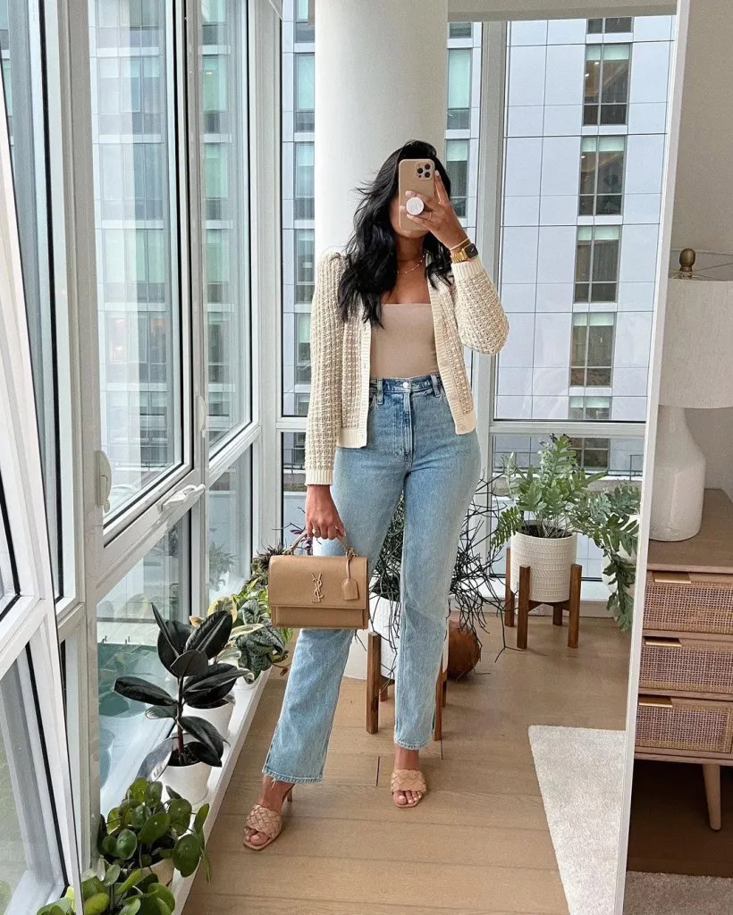 This ensemble perfectly embodies the balance between professional and relaxed that business casual with jeans aims to achieve. The light-wash straight-leg jeans offer a modern, laid-back foundation, while the cream-colored knit cardigan adds a touch of sophistication.