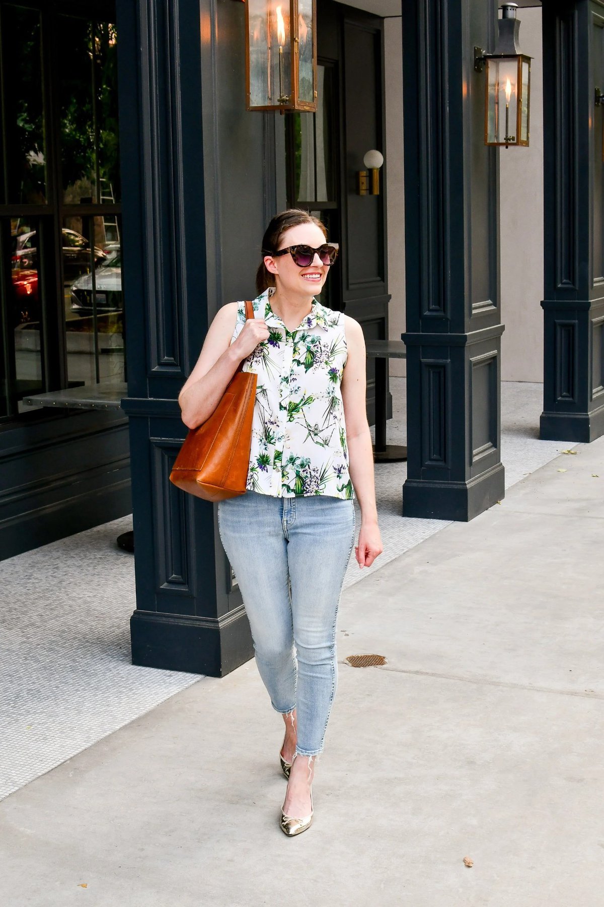 This outfit perfectly balances casual and professional elements, making it an ideal choice for a business casual environment. The light wash jeans provide a relaxed foundation, while the sleeveless floral blouse adds a touch of sophistication and seasonal flair.