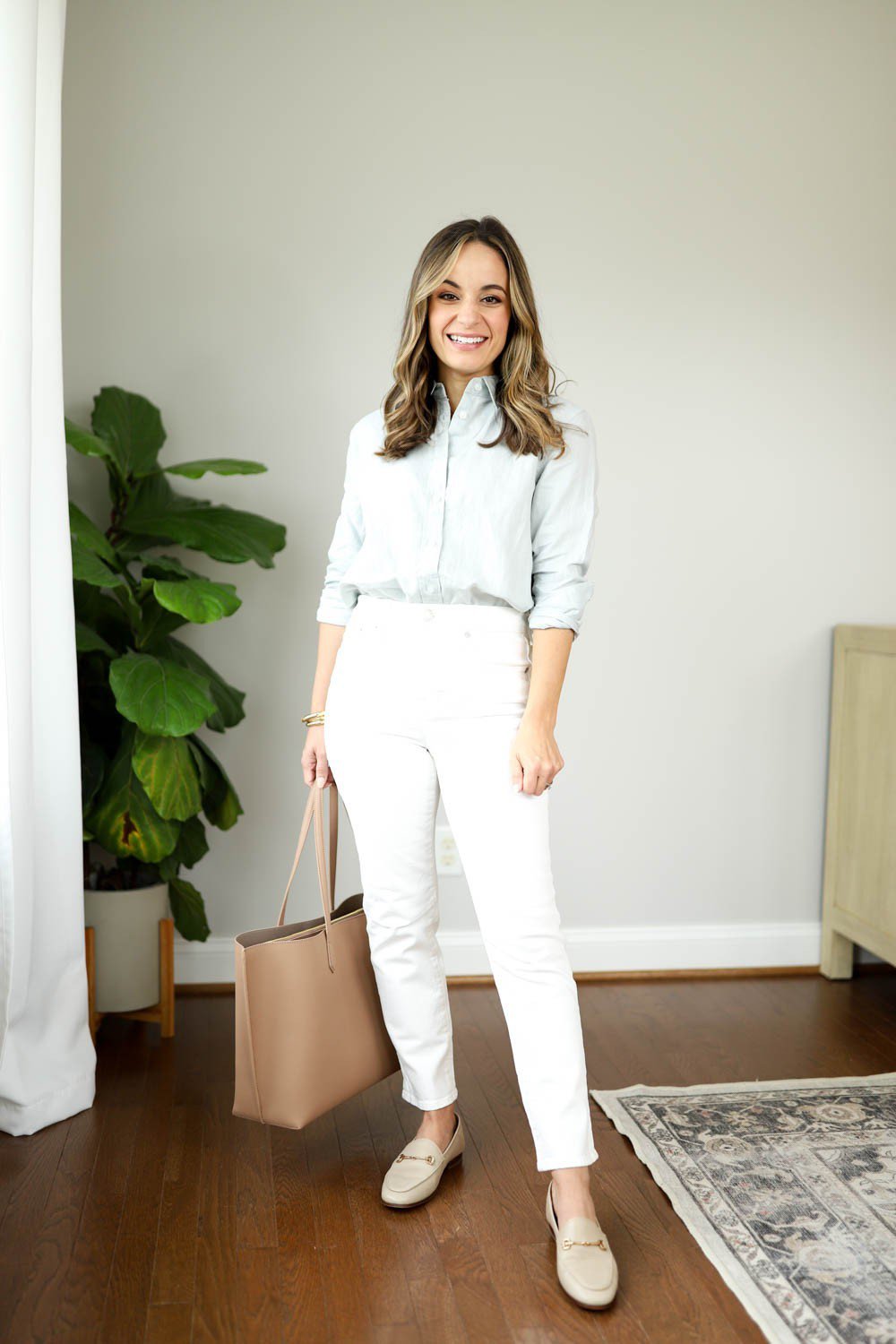 The crisp white denim offers a modern twist on traditional work attire, while maintaining a professional appearance. Paired with neutral accessories like beige loafers and a tan tote, this outfit strikes the ideal balance between casual comfort and office-appropriate style.