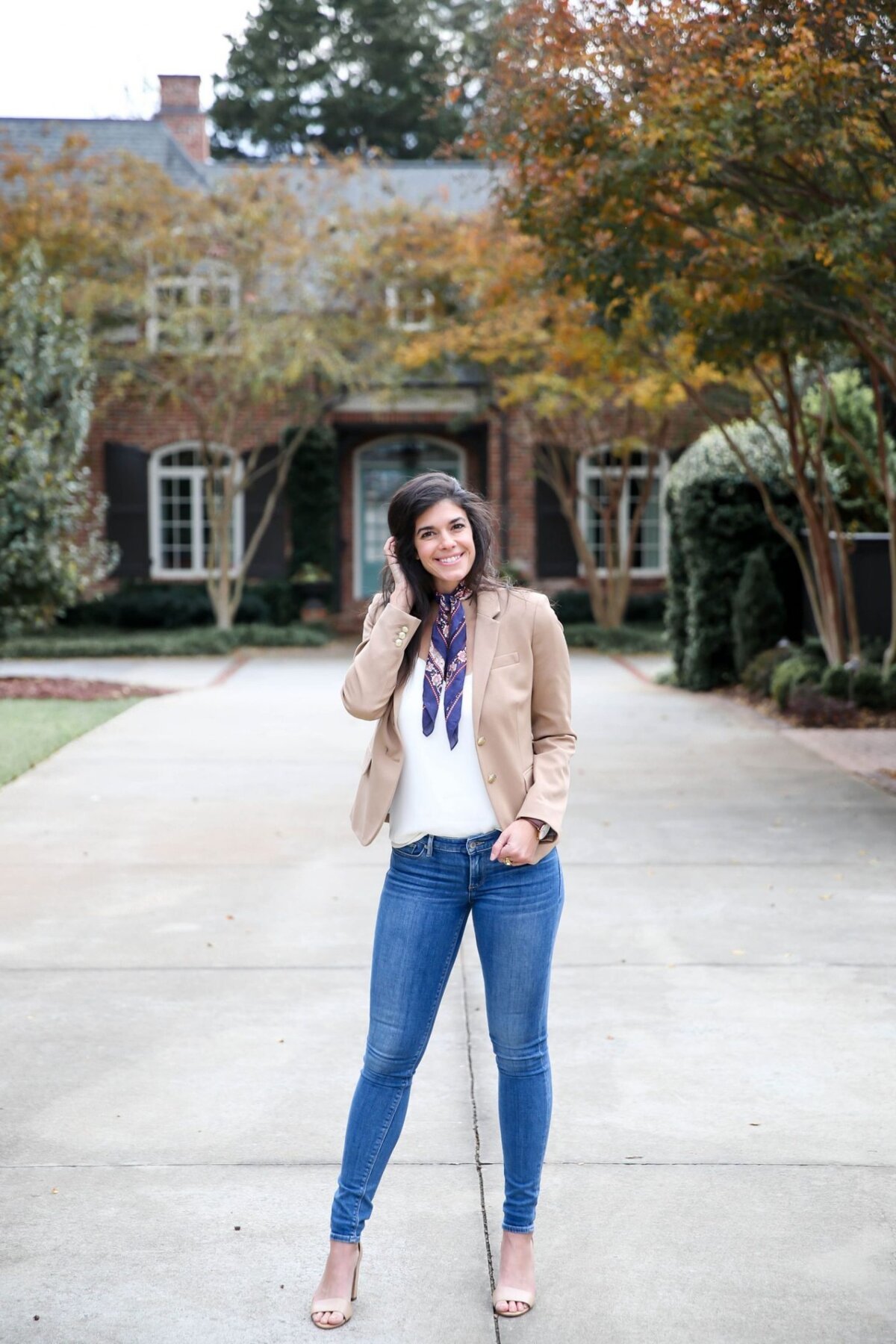This ensemble exemplifies how to elevate jeans for a business casual setting. The combination of a crisp white top, camel blazer, and blue silk scarf creates a polished look thats both professional and approachable.