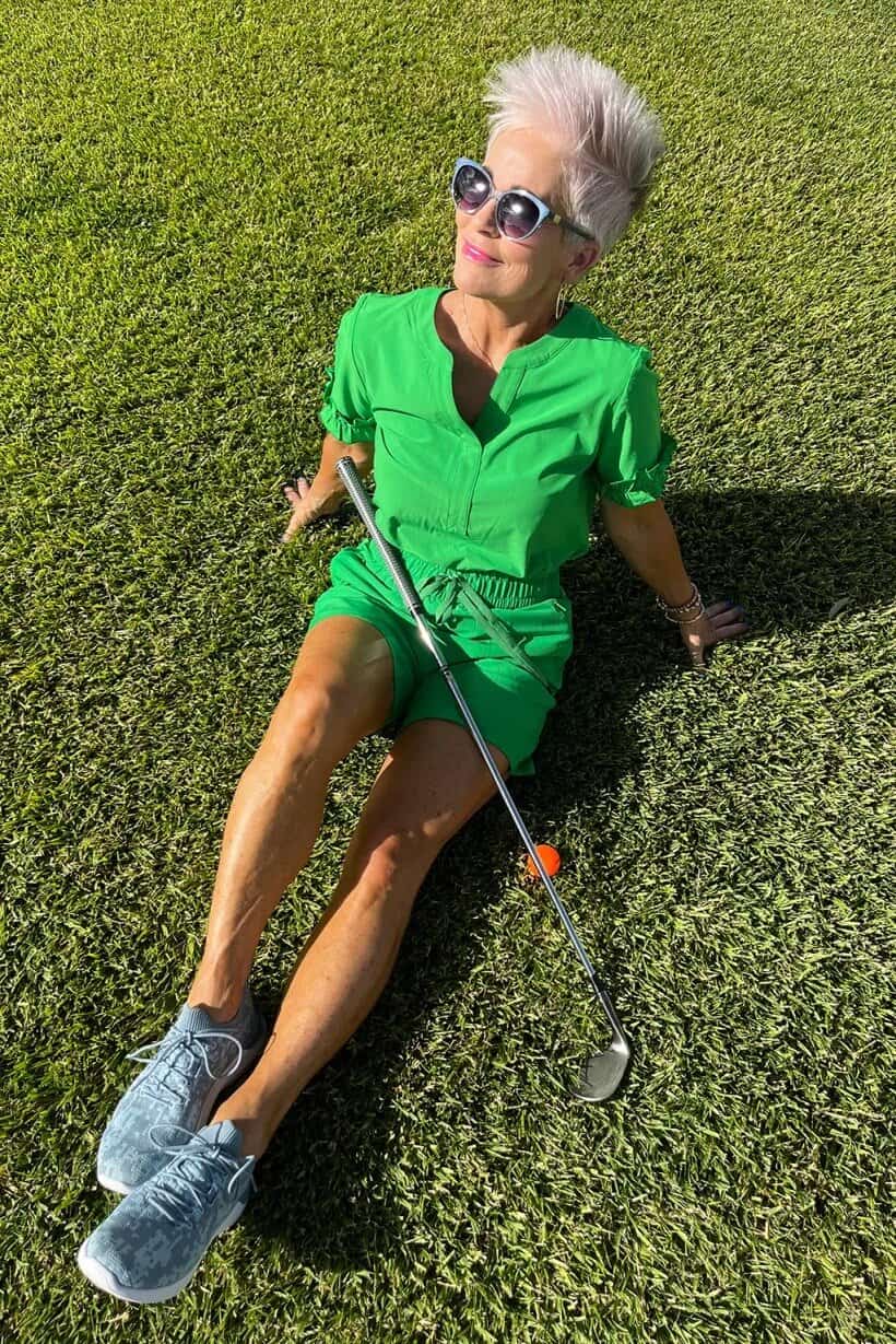 Make a bold statement on the golf course with this eye-catching vibrant green romper. Perfect for those crisp fall days, this outfit combines style and functionality. The romper’s lightweight fabric allows for easy movement during your swing, while the bright color adds a pop of personality to your golf attire. Paired with comfortable gray sneakers and chic sunglasses, this ensemble proves that golf fashion can be both trendy and practical. The short sleeves and shorts length make it ideal for transitional weather, keeping you cool yet covered. This outfit demonstrates how women can bring flair to traditional golf wear, elevating course fashion with a modern twist.