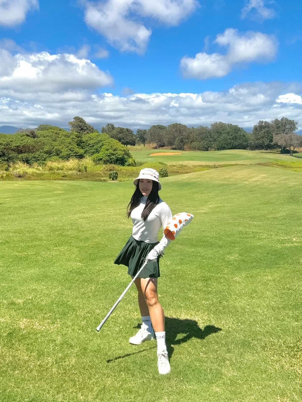 This timeless combination of a crisp white top and forest green skirt embodies the perfect balance of style and functionality for fall golfing. The long-sleeved white shirt offers protection against cooler breezes while maintaining a sleek silhouette. The pleated green skirt adds a touch of femininity and allows for easy movement during swings. Paired with white sneakers and socks, this outfit ensures comfort throughout your round. The white bucket hat not only completes the look but also provides essential sun protection. This ensemble demonstrates how simplicity in color choice can create an elegant and course-appropriate outfit that’s perfect for those crisp autumn days on the green.