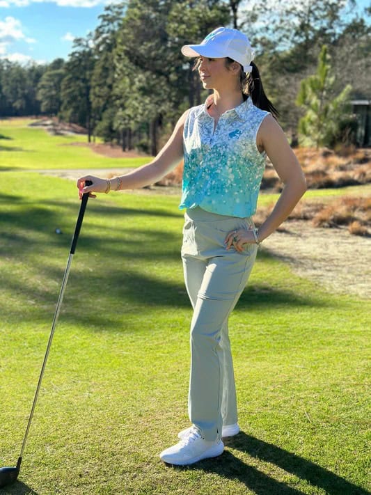 This ensemble perfectly balances style and functionality for a crisp fall day on the golf course. The sleeveless ombre top, transitioning from white to a refreshing aqua blue, adds a pop of color while allowing for unrestricted arm movement during swings. Paired with classic khaki pants, it creates a polished look that’s both trendy and appropriate for the course. The white cap not only complements the outfit but also provides sun protection. Finished with pristine white golf shoes, this outfit demonstrates how to incorporate seasonal colors into your golfing attire while maintaining a professional appearance. It’s an ideal choice for those seeking a fashionable yet practical fall golf outfit.