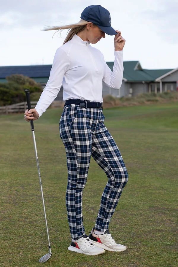 This ensemble perfectly balances traditional golf attire with contemporary style. The crisp white long-sleeve top provides a clean, polished base, while the navy and white plaid pants add a touch of classic golf fashion. The fitted silhouette of both pieces creates a sleek, streamlined look that’s both flattering and functional. A navy cap not only protects from the sun but also complements the outfit’s color scheme. The white athletic shoes with red accents offer a modern twist, ensuring comfort without sacrificing style. This outfit demonstrates how to incorporate timeless patterns into a fresh, fashion-forward golf look that’s ideal for cooler fall days on the course.