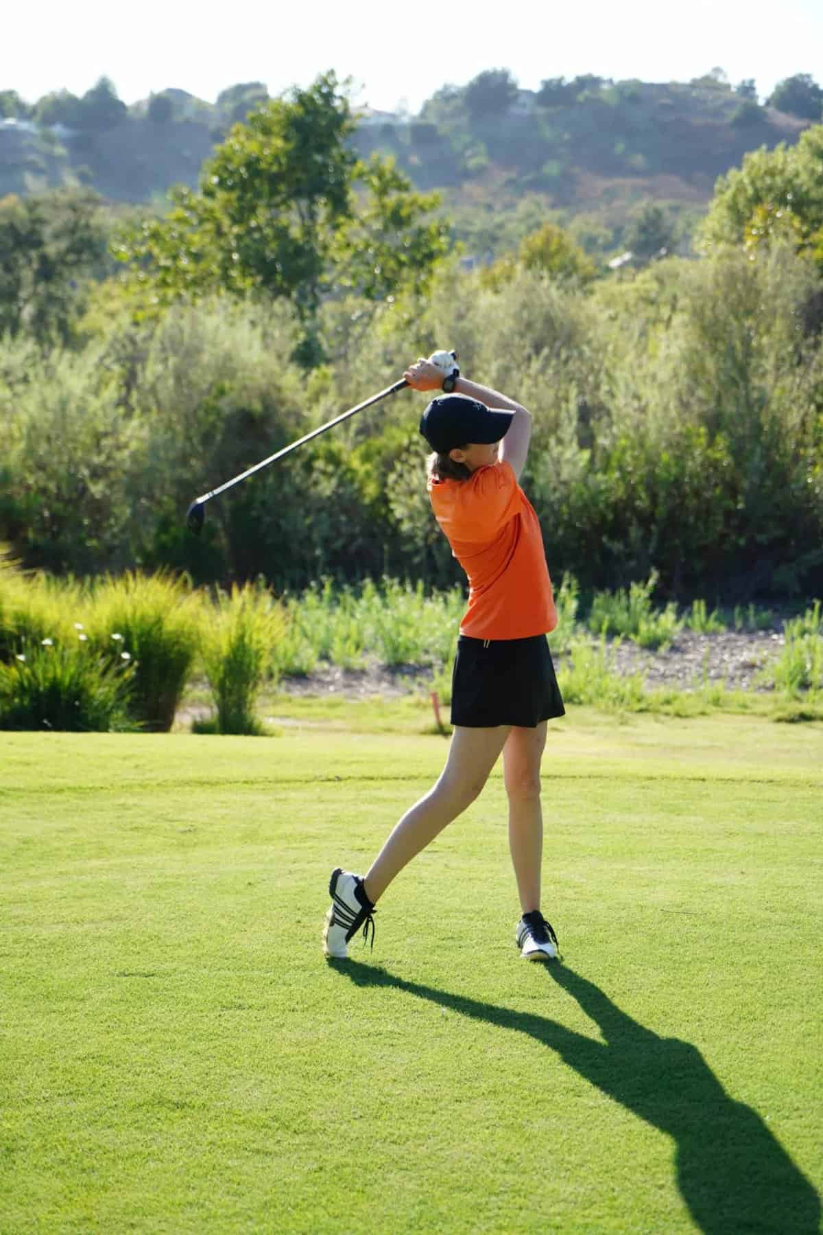 Make a bold statement on the fairway with this eye-catching orange and black combination. The bright orange polo shirt adds a pop of color that’s perfect for the fall season, while the classic black skirt provides a sleek contrast. This outfit not only looks stylish but also offers functionality with moisture-wicking fabrics to keep you comfortable during your round. The ensemble is completed with white golf shoes, offering both style and stability. This look demonstrates how you can incorporate autumn hues into your golf wardrobe while maintaining a professional and athletic appearance. It’s an ideal choice for those crisp fall days when you want to stand out on the course.