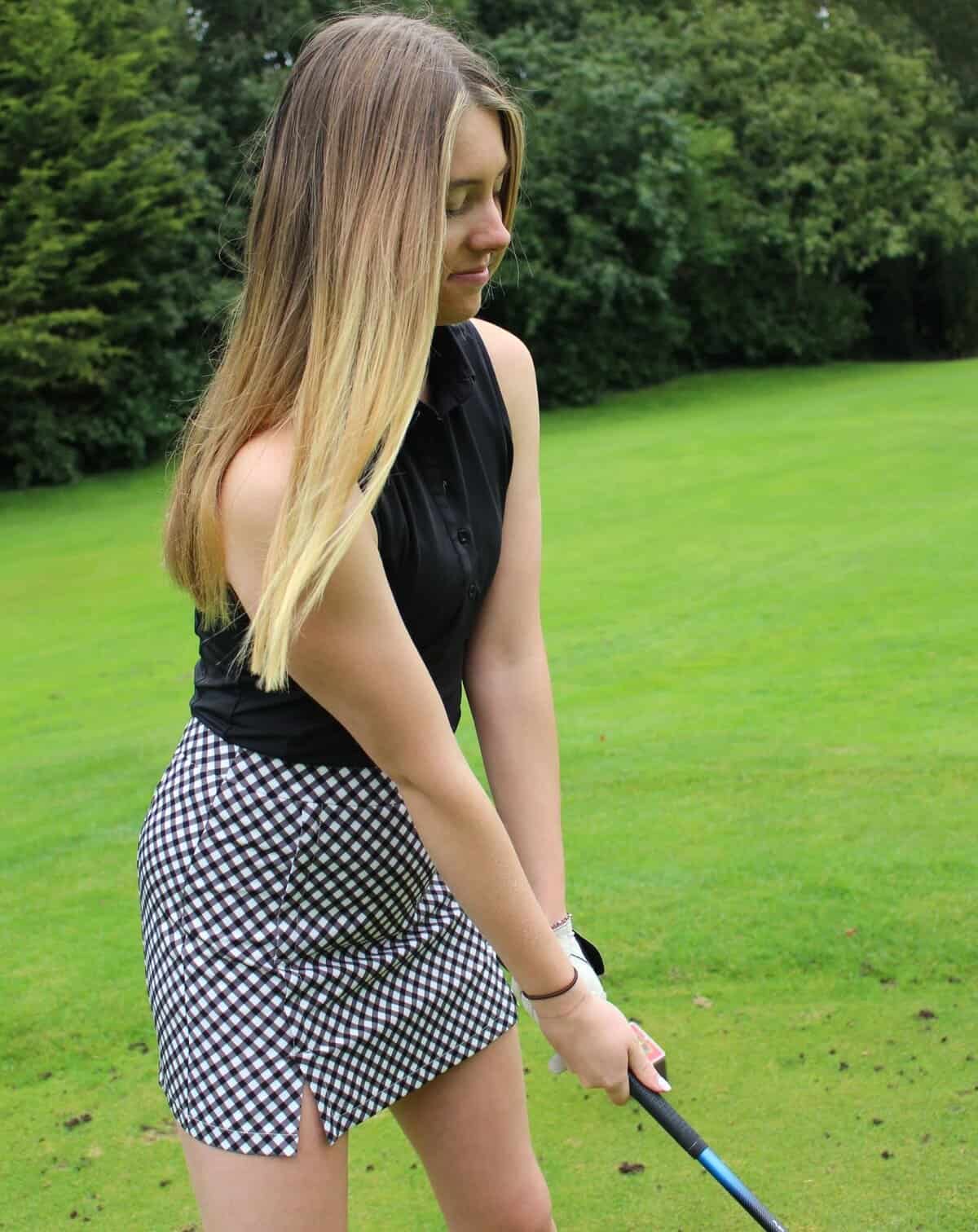 This stylish ensemble perfectly blends classic golf attire with modern flair. The black sleeveless top offers a sleek, sophisticated look while providing comfort and freedom of movement for your swing. The standout piece is the gingham skirt, which adds a playful touch to the outfit without sacrificing elegance. The black and white check pattern is timeless and versatile, making it an excellent choice for fall golf outings. The skirt’s length is ideal for the course, striking a balance between style and practicality. Paired with the right accessories, this outfit transitions seamlessly from the fairway to the clubhouse, embodying the perfect blend of fashion and function for the fashion-forward golfer.