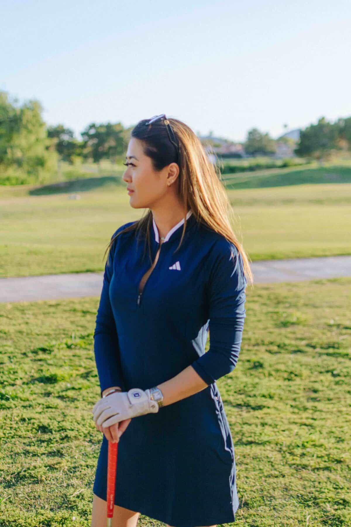 Who says you can’t bring a touch of elegance to the golf course? This figure-hugging little black dress proves that style and sport can coexist beautifully. The short-sleeved, form-fitting design allows for a full range of motion while maintaining a chic silhouette. Paired with white ankle socks and matching sneakers, this outfit strikes the perfect balance between fashion-forward and functional. The dress’s side slit adds a subtle flair and ensures ease of movement when tackling those tricky bunker shots. This ensemble demonstrates that fall golf fashion can be both sophisticated and practical, allowing you to transition seamlessly from the course to the clubhouse.