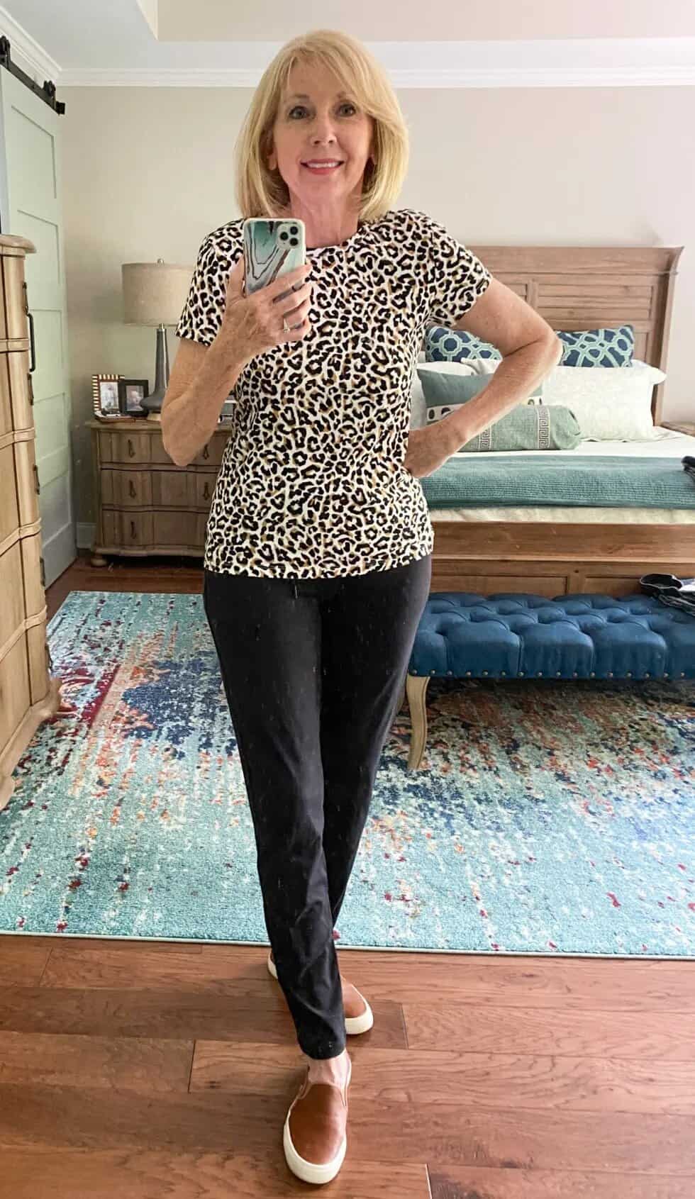 Elevate your fall workout wardrobe with this chic combination of a bold leopard print top and sleek black pants. The eye-catching animal print adds a touch of style to your fitness routine, while the comfortable, loose-fitting top allows for easy movement during exercise. Paired with classic black pants, this outfit strikes the perfect balance between fashion-forward and functional. The ensemble is completed with slip-on sneakers, ideal for quick transitions from home to gym. This look proves that workout wear can be both practical and stylish, giving you an extra boost of confidence and motivation for your autumn fitness sessions.