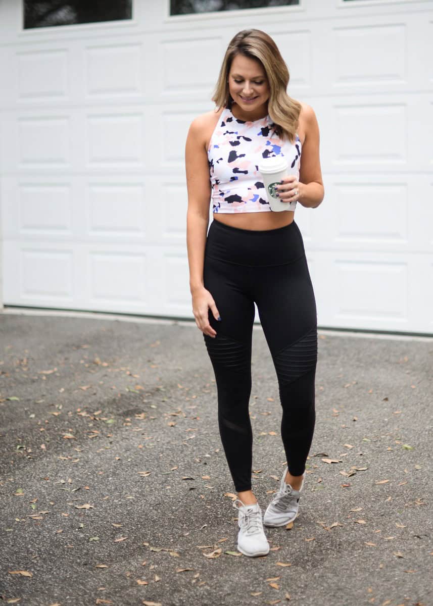 This stylish fall workout ensemble combines comfort and fashion effortlessly. The patterned crop top in soft pastel hues adds a playful touch to the outfit, while the high-waisted black leggings provide a sleek, elongating effect. The contrast between the fitted top and form-hugging bottoms creates a balanced silhouette that’s both flattering and functional. Paired with light-colored sneakers, this outfit is perfect for a range of fall activities, from outdoor runs to gym sessions. The look exudes confidence and motivation, making it an ideal choice for those crisp autumn days when you need an extra boost to stick to your fitness routine.