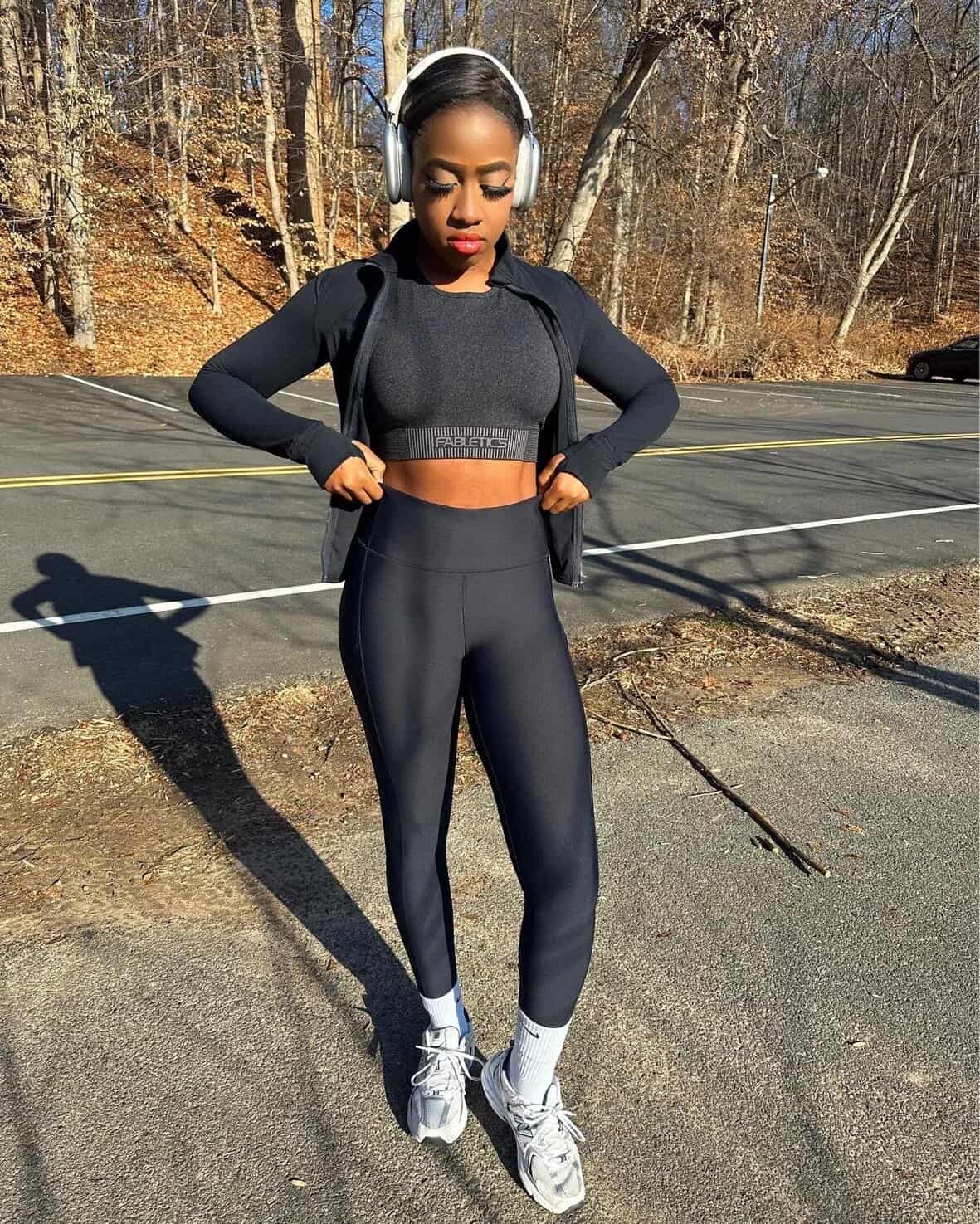 Kick off your fall fitness journey with this chic and versatile all-black workout outfit. The ensemble features high-waisted leggings paired with a cropped top, accentuated by a stylish zip-up jacket. This monochromatic look not only flatters all body types but also provides the perfect canvas for layering as temperatures fluctuate. The fitted silhouette allows for unrestricted movement during your workout, while the darker hues are ideal for concealing sweat. Complete the look with comfortable running shoes and wireless headphones to keep you motivated and in the zone throughout your outdoor fall workouts. This outfit seamlessly transitions from the gym to casual outings, making it a must-have for your autumn fitness wardrobe.