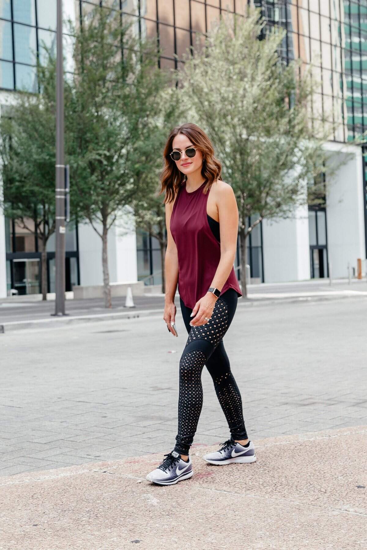 Elevate your fall workout wardrobe with this chic and functional ensemble. The burgundy tank top adds a rich, seasonal hue while providing breathability for intense workouts. Paired with sleek black leggings featuring an eye-catching gold dot pattern, this outfit offers both style and performance. The look is completed with comfortable running shoes and trendy sunglasses, making it perfect for outdoor autumn exercises. This combination strikes an ideal balance between fashion-forward design and practical athleticism, ensuring you’ll feel confident and motivated whether you’re hitting the gym or going for a brisk fall jog in the city.