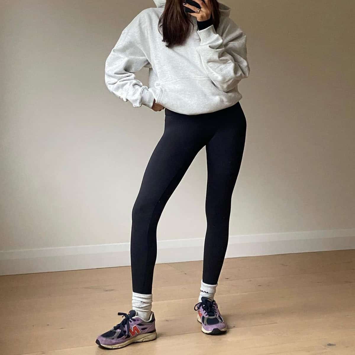 Embrace the cool autumn weather with this effortlessly chic workout ensemble. The oversized white sweatshirt provides warmth and comfort, perfect for outdoor exercises or as a post-workout layer. Paired with sleek black leggings, this outfit offers both style and functionality. The contrast between the loose-fitting top and form-fitting bottoms creates a balanced silhouette. Chunky socks and colorful sneakers add a pop of personality and ensure your feet stay cozy during your fall fitness routine. This versatile look transitions seamlessly from a brisk morning jog to a casual coffee run, keeping you motivated and fashionable throughout the season.