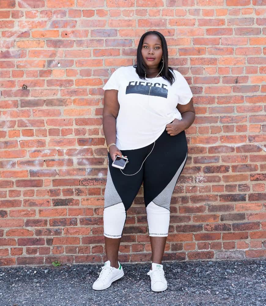 This stylish fall workout ensemble combines comfort and motivation, perfect for boosting your fitness drive. The white graphic tee featuring the empowering word ‘FIERCE’ sets a determined tone for your workout. Paired with sleek color-block leggings in black, gray, and white, this outfit offers both style and functionality. The cropped length of the leggings is ideal for cooler autumn temperatures, while the contrasting panels create a flattering silhouette. Completed with classic white sneakers, this look is versatile enough for both gym sessions and casual outings. The outfit’s monochromatic palette makes it easy to mix and match with other fall wardrobe pieces, ensuring you stay motivated and fashionable throughout the season.