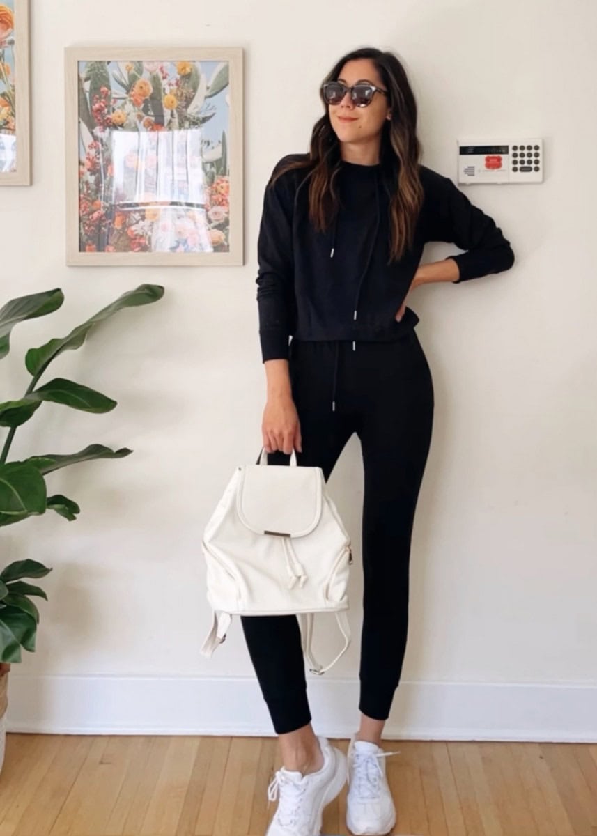 Elevate your fall workout wardrobe with this chic all-black activewear ensemble. The matching set features a long-sleeve top and form-fitting leggings, perfect for transitional weather. The monochromatic look is not only slimming but also versatile, allowing you to mix and match with other pieces. Paired with white sneakers and a contrasting white backpack, this outfit strikes the perfect balance between style and functionality. The dark hue is ideal for cooler autumn days, while the fitted silhouette ensures unrestricted movement during your workouts. This sleek combination proves that fitness attire can be both practical and fashionable, boosting your confidence and motivation as you tackle your fall fitness goals.