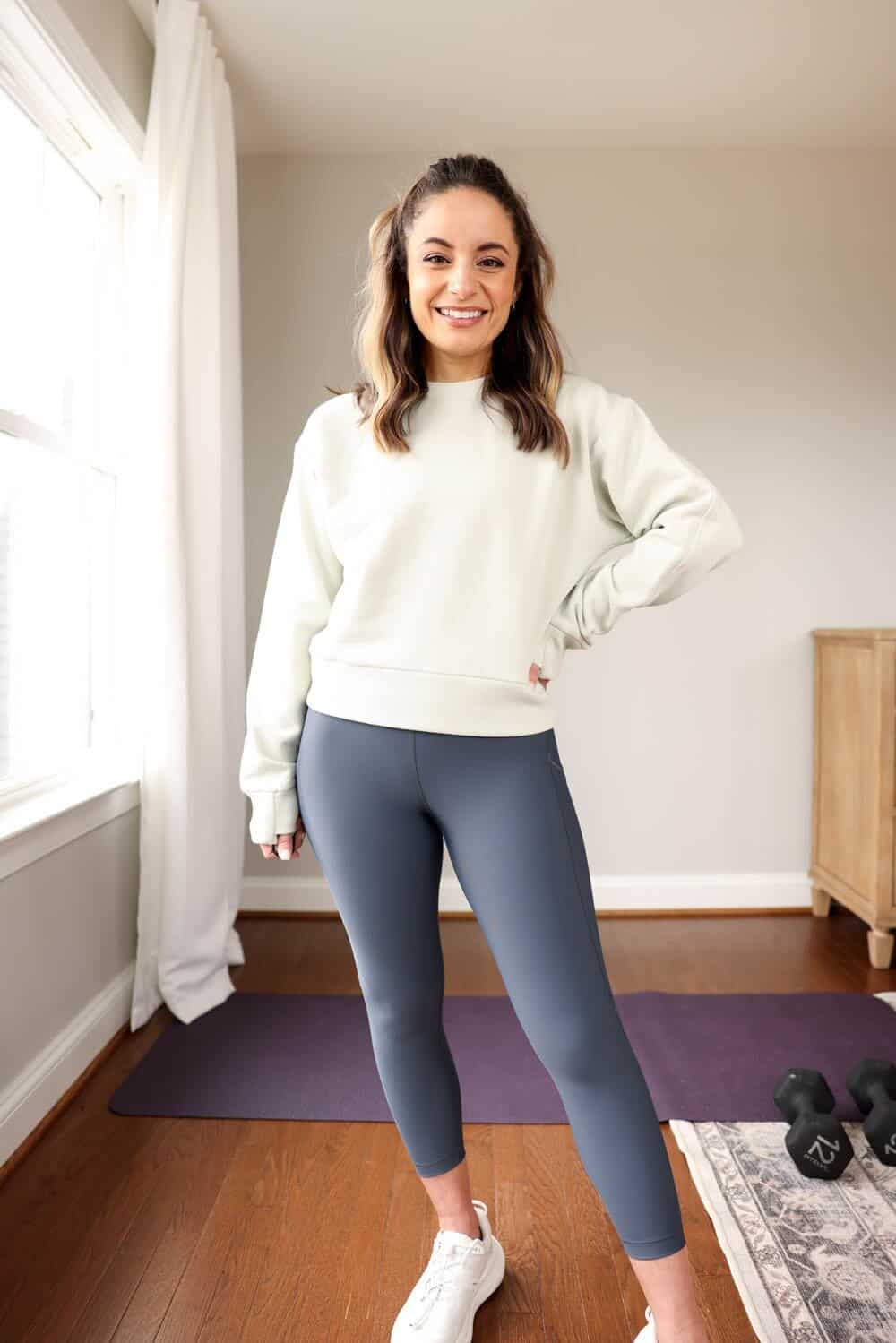 Embrace the crisp fall weather with this perfect blend of comfort and style. The plush cream-colored sweatshirt offers warmth and a relaxed fit, ideal for those cooler autumn mornings. Paired with sleek slate-blue leggings, this outfit provides the flexibility and support needed for any workout. The neutral color palette is quintessentially fall, while the fitted silhouette ensures you look put-together even during intense exercise sessions. Complete with white sneakers for a clean, coordinated look, this ensemble proves that you don’t have to sacrifice style for functionality. It’s the perfect motivation to keep your fitness routine going strong as the seasons change.