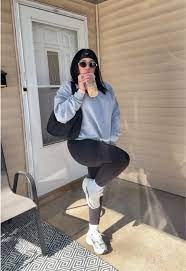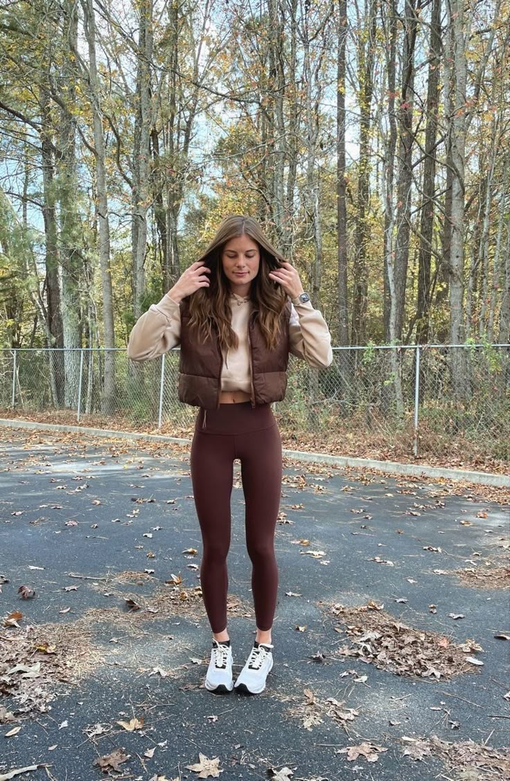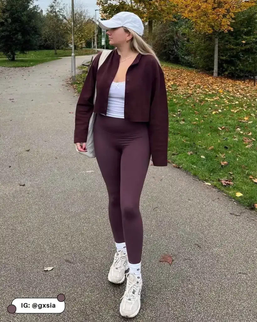 Paired with a cropped beige sweater and a matching brown puffer vest, this ensemble creates a cohesive, earth-toned palette that”s ideal for fall. The combination of fitted leggings and a layered top strikes the right balance between casual and put-together, while white sneakers add a sporty touch.