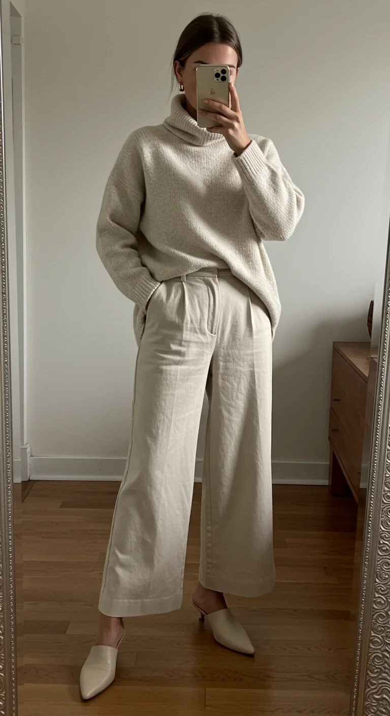The cream-colored ensemble features a soft, oversized turtleneck sweater paired with wide-leg palazzo pants.