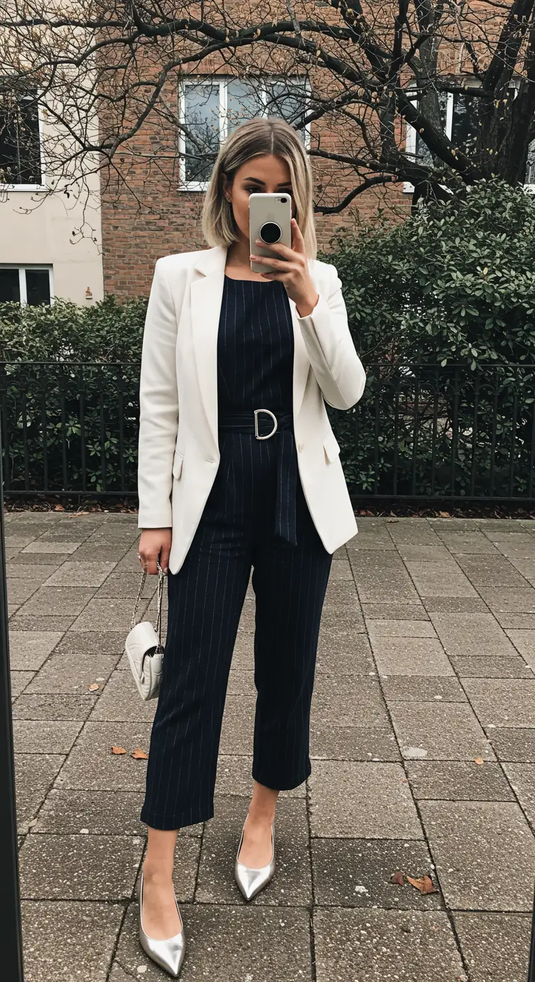 A double-breasted blazer exudes confidence, balanced with a simple white t-shirt underneath.