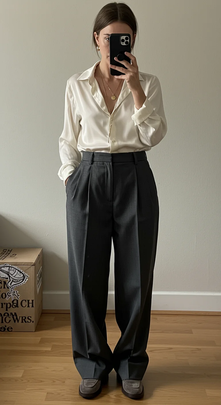 A flowing silk blouse in soft peach adds elegance, while a structured cream blazer keeps it professional.