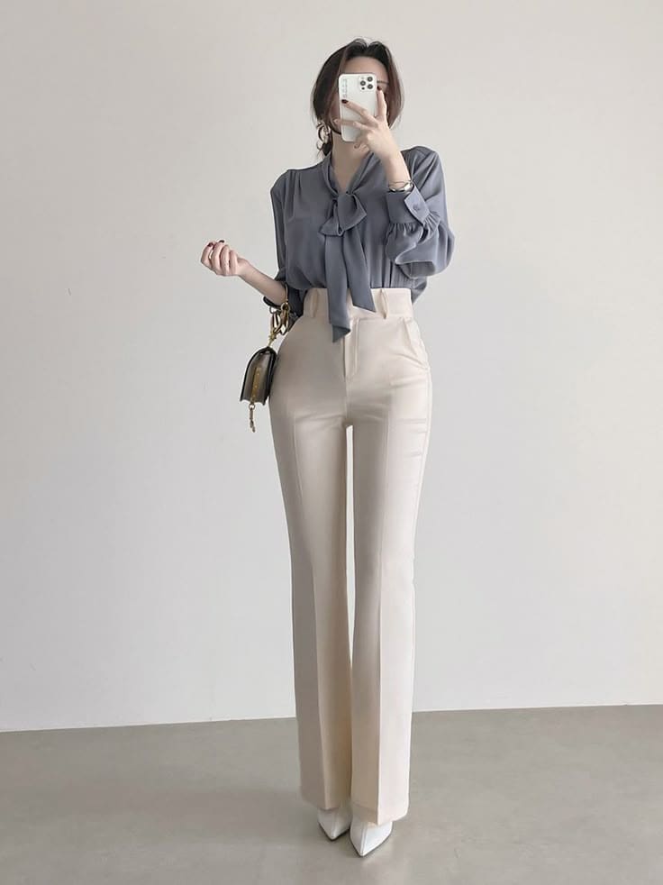 Elevate your classroom style with this sophisticated ensemble that exudes professionalism and grace. The crisp white bow blouse adds a touch of femininity and charm, while the high-waisted black trousers create a sleek, elongated silhouette.