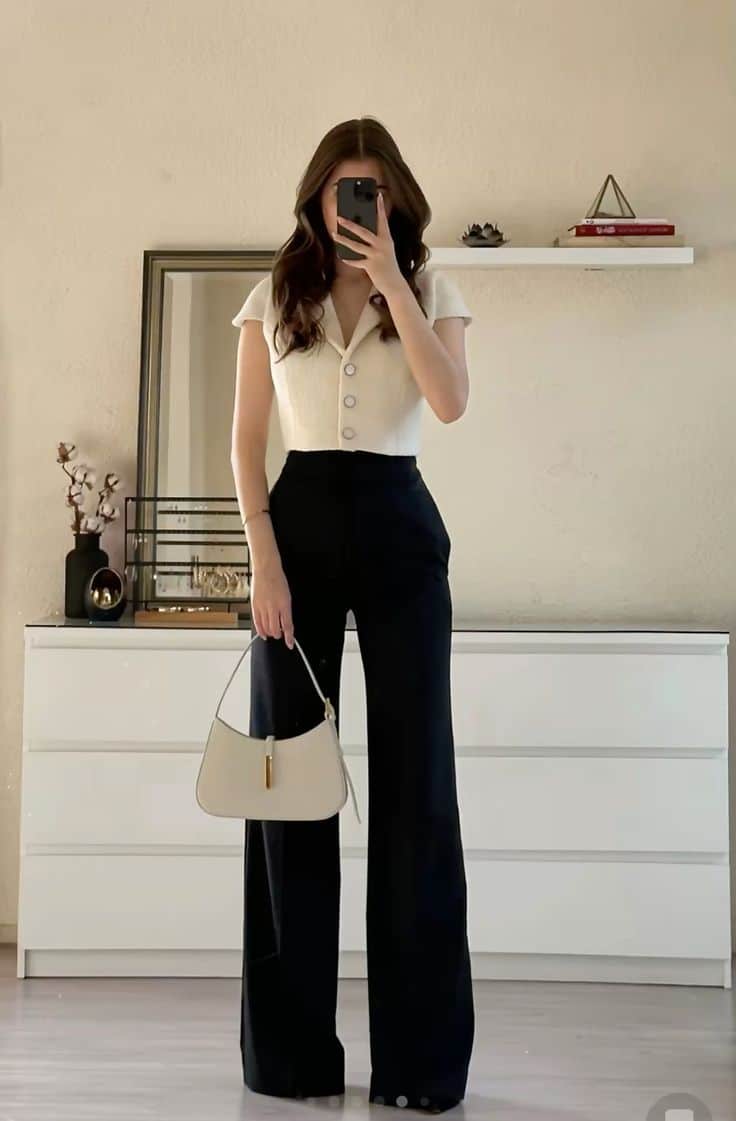 Paired with sleek, high-waisted black trousers, the outfit creates a lengthening silhouette that exudes confidence. The wide-leg cut of the pants adds a modern touch while maintaining a classic look.