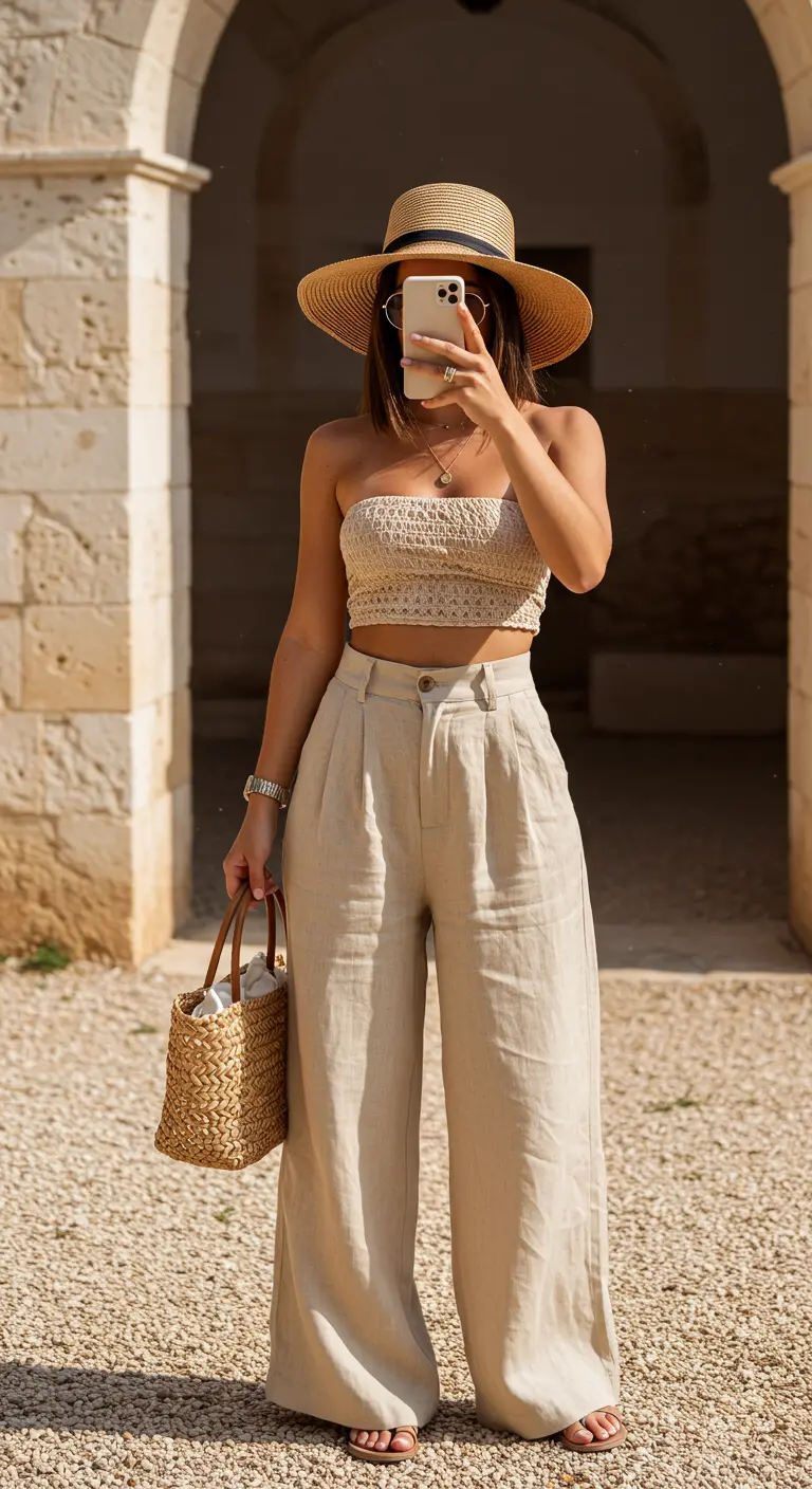 Complete the look with a wide-brimmed sun hat and comfortable sandals.