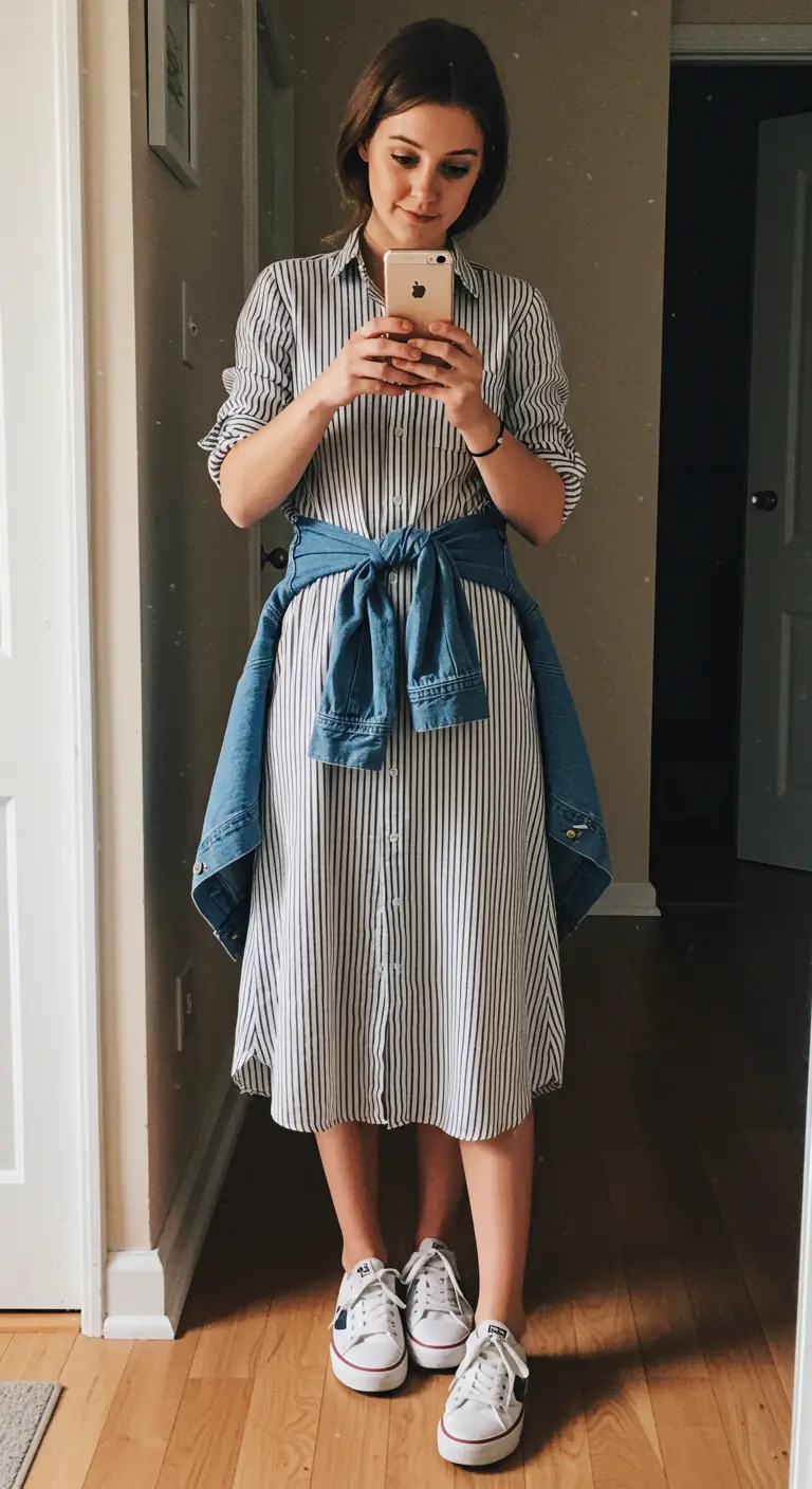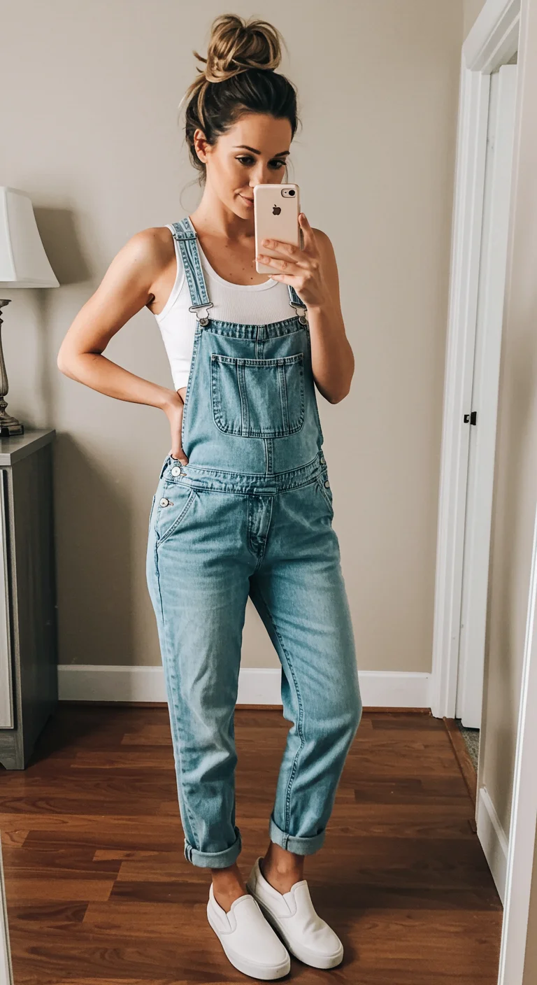 White canvas sneakers keep the outfit relaxed and comfortable.