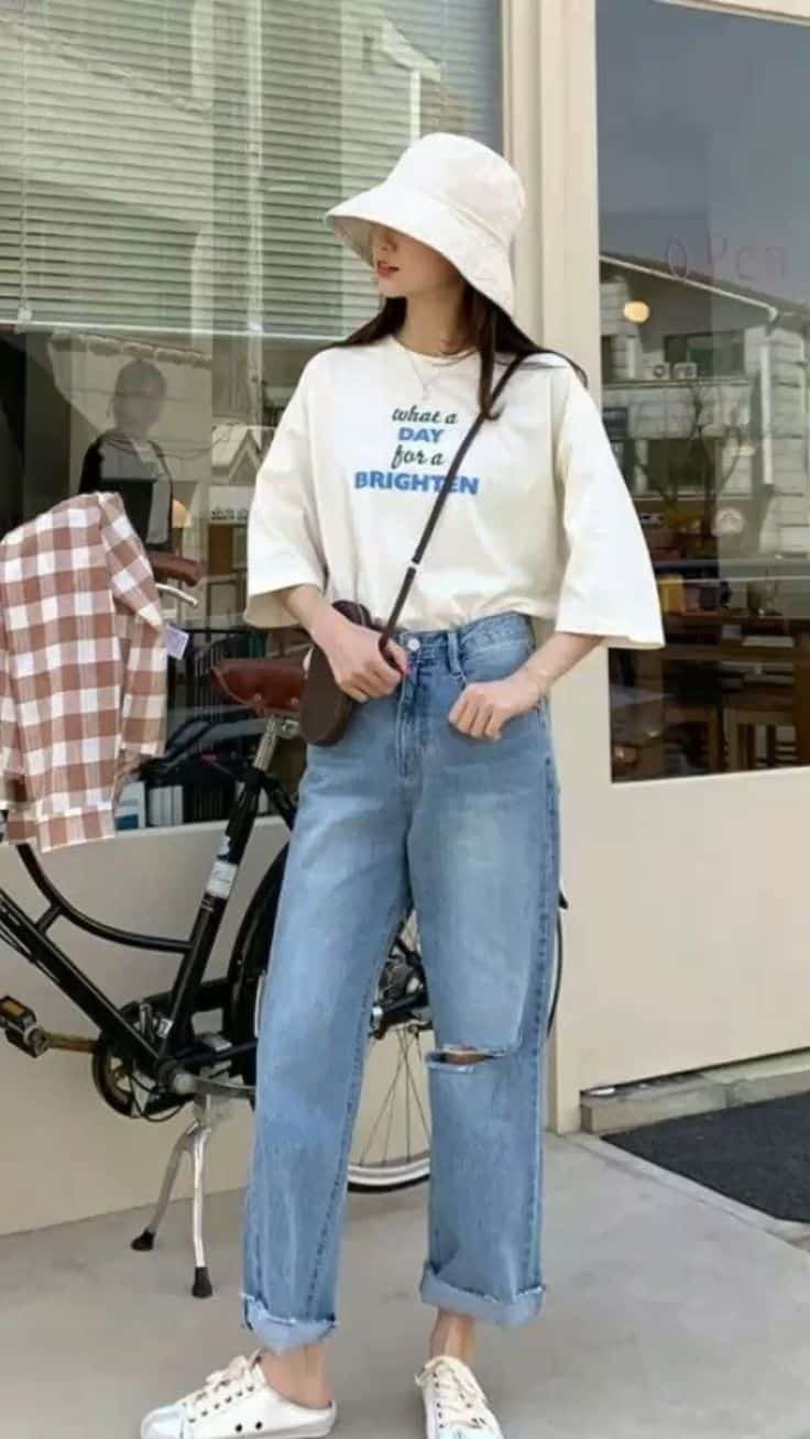 This outfit perfectly captures the essence of beach vibes meeting campus style. The oversized white graphic tee with its optimistic message sets a carefree tone, while the light-wash distressed jeans add a touch of casual cool.