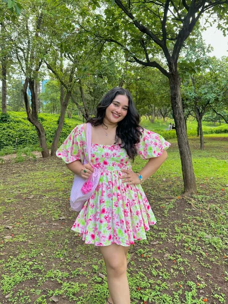 This vibrant floral dress effortlessly bridges the gap between beach vibes and campus style. The playful pink and green print exudes a sun-kissed, carefree energy while the puff sleeves and fitted waist create a polished silhouette perfect for class.