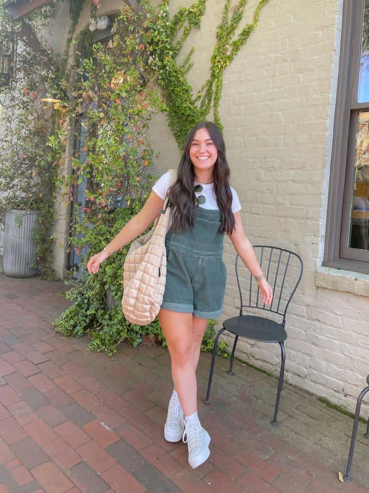 Embrace the laid-back coastal vibe while staying campus-ready with this effortlessly chic ensemble. The olive green overalls paired with a crisp white tee create a perfect balance of casual comfort and put-together style.