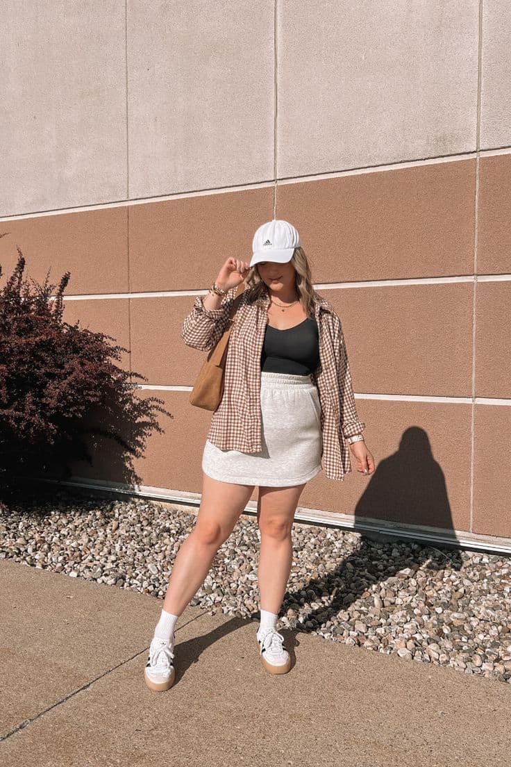 This outfit perfectly blends beach-inspired comfort with campus-ready style. The light gingham overshirt adds a touch of preppy charm, while the relaxed grey skirt keeps things casual and comfortable for those long days of lectures.