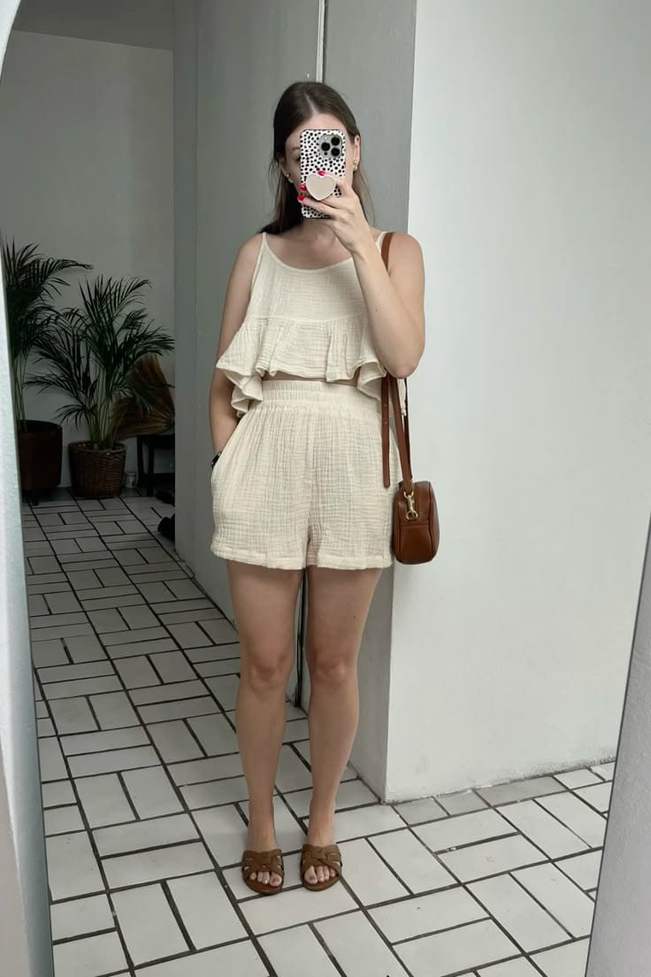 This effortlessly chic linen two-piece set perfectly embodies the beach-to-campus transition. The cream-colored ensemble features a flowy cropped tank with a ruffle detail and matching high-waisted shorts, creating a cohesive and put-together look.