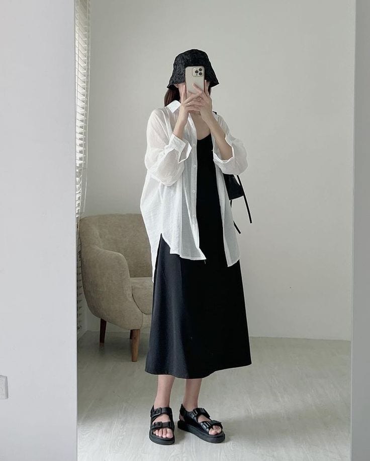 This ensemble effortlessly blends beach-inspired ease with campus-ready sophistication. The flowing white button-up shirt, worn open over a sleek black maxi dress, creates a layered look that’s both relaxed and polished.