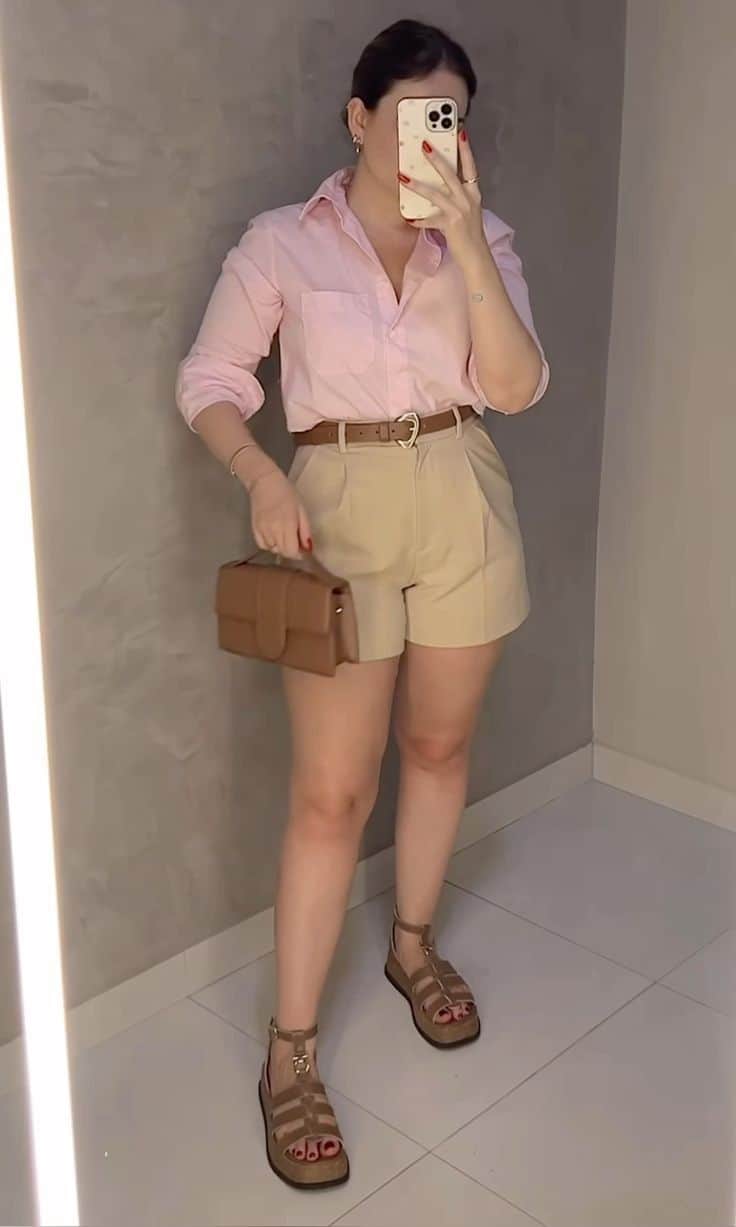 This outfit perfectly blends beachy vibes with campus-ready style. The soft pink button-down shirt exudes a relaxed, sun-kissed feel, while the khaki shorts add a touch of sophistication.