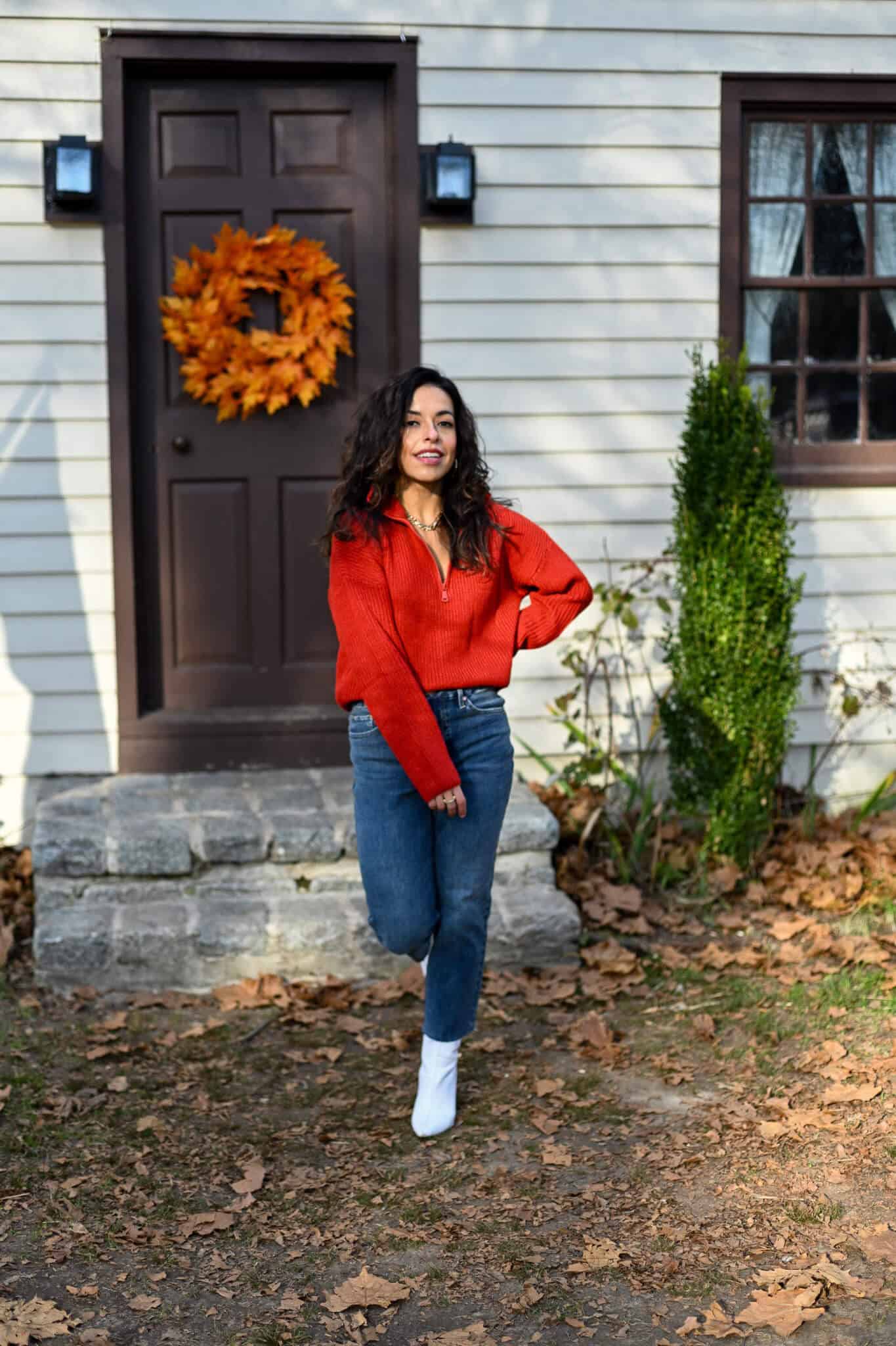 Embrace the essence of autumn with this effortlessly chic ensemble that perfectly balances comfort and style. The vibrant red sweater steals the show, its chunky knit texture adding warmth and visual interest while the zippered neckline offers versatility. Paired with classic blue jeans and trendy white ankle boots, this outfit creates a striking contrast that’s both eye-catching and seasonally appropriate. The casual yet polished look is ideal for a variety of fall activities, from pumpkin picking to cozy coffee dates. Set against the backdrop of a charming house with a fall wreath, this outfit embodies the spirit of the season, proving that autumn style can be both swoon-worthy and effortlessly cool.