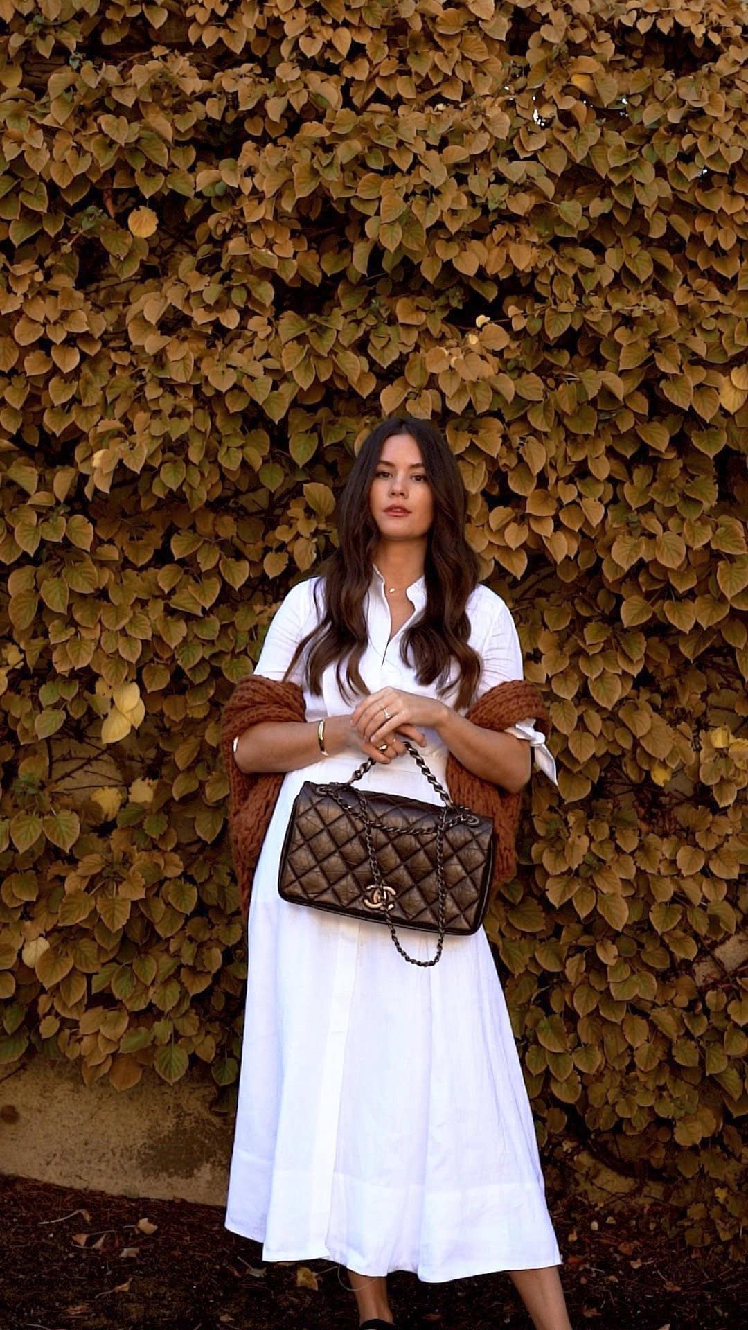 Embrace the transition from summer to fall with this effortlessly chic ensemble. A pristine white maxi dress serves as the perfect canvas for autumnal accessories, creating a look that’s both fresh and seasonally appropriate. The dress’s crisp fabric and button-up detail exude sophistication, while the flowing silhouette offers comfort and elegance. A rich brown cardigan draped over the shoulders adds warmth and texture, echoing the golden hues of the surrounding foliage. The outfit is elevated by a quilted designer handbag in deep brown, introducing a touch of luxury. This look masterfully balances light and dark elements, embodying the essence of fall fashion with its blend of summer’s lingering brightness and autumn’s encroaching warmth.
