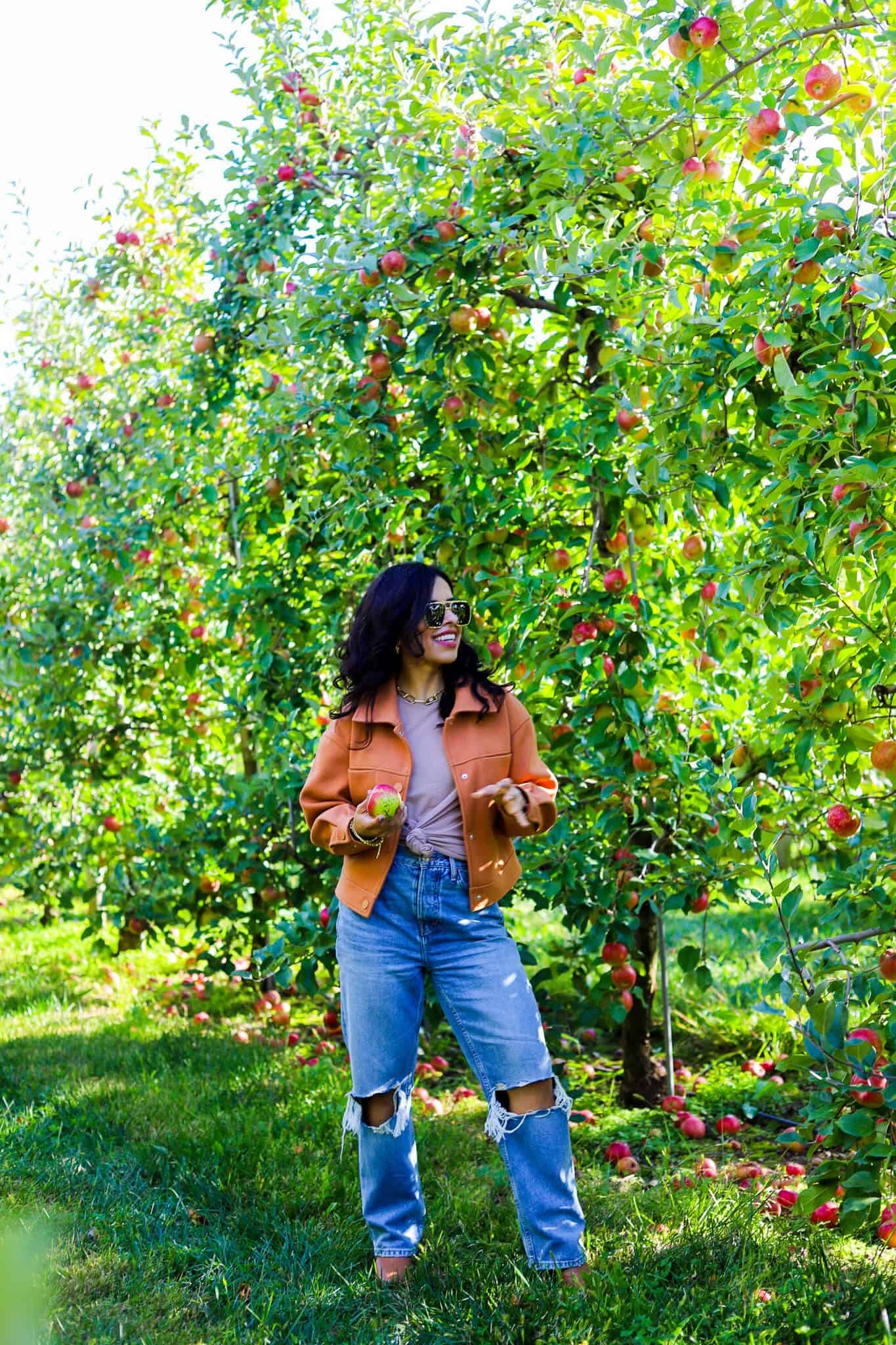Embrace the essence of autumn with this effortlessly chic ensemble perfect for a day at the apple orchard. The standout piece is a burnt orange jacket that captures the warm hues of falling leaves, paired harmoniously with a neutral top and classic distressed jeans. This look strikes the ideal balance between style and comfort, allowing for easy movement while picking apples or enjoying a hayride. The vibrant jacket adds a pop of seasonal color, elevating a casual outfit to a fashion-forward statement. Accessorized with oversized sunglasses and a chunky chain necklace, this outfit embodies fall’s playful yet sophisticated spirit, proving that autumn style can be both functional and swoon-worthy.