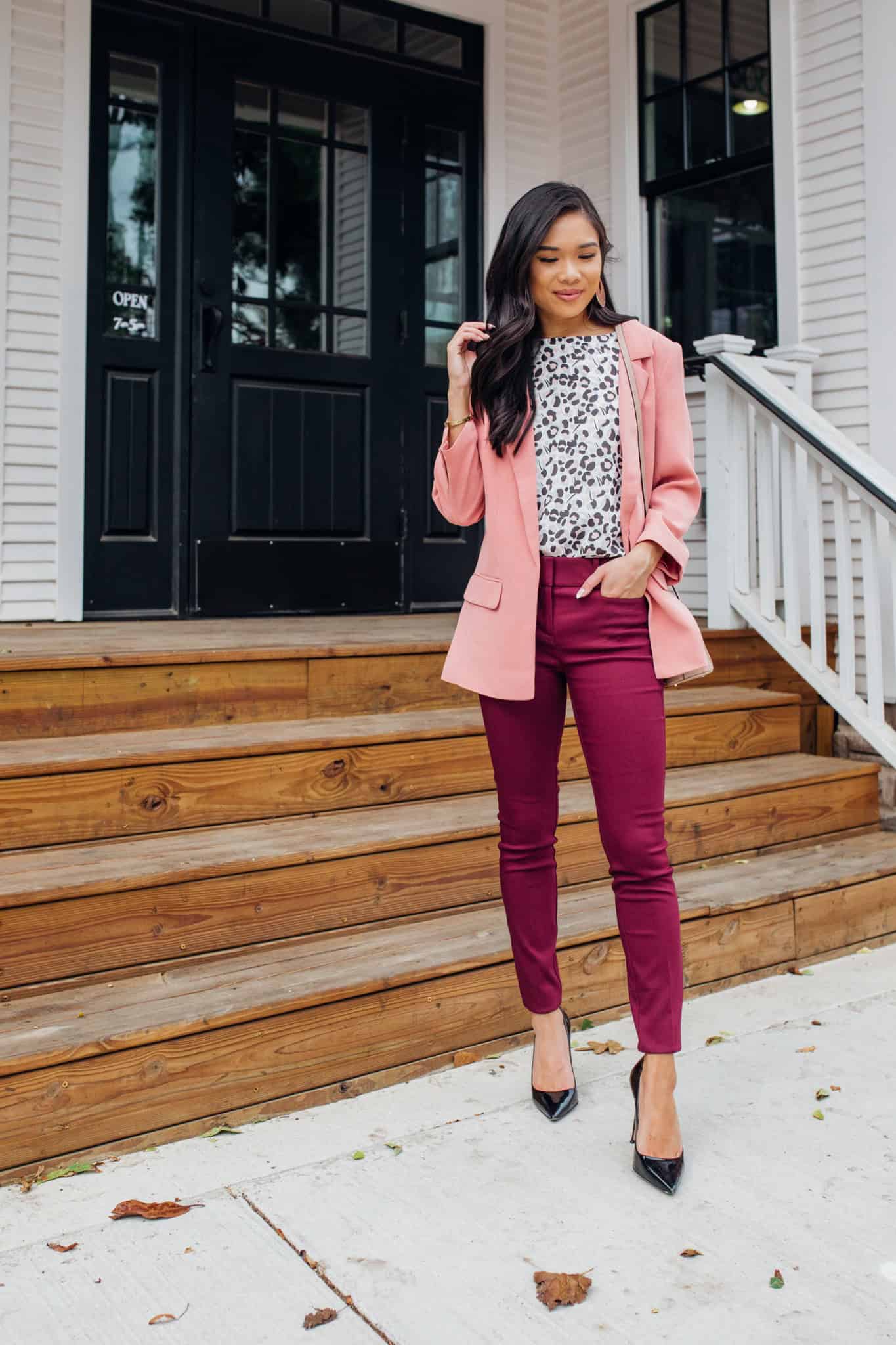 Elevate your autumn style with this sophisticated yet playful ensemble. The soft pink blazer adds a touch of femininity while providing warmth for crisp fall days. Paired with rich burgundy pants, this outfit creates a striking color contrast that’s perfect for the season. The leopard print top introduces a fun pattern, bridging the gap between the solid-colored pieces. Sleek black pumps complete the look, adding a touch of elegance. This outfit seamlessly blends professional polish with seasonal flair, making it ideal for both office settings and after-work gatherings. The combination of textures and colors embodies the essence of fall chic, offering a fresh take on autumnal dressing that’s sure to turn heads.