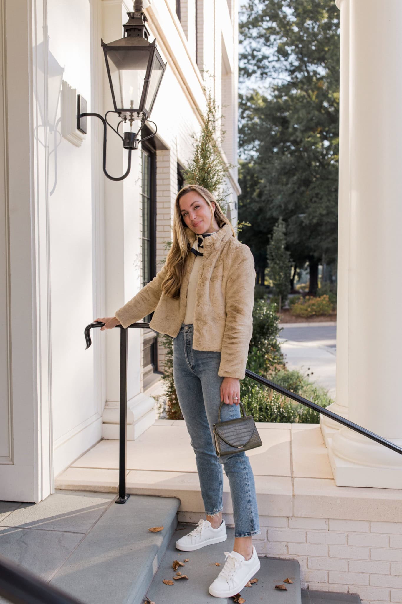 Embrace the crisp autumn air with this effortlessly chic ensemble that perfectly balances comfort and style. The standout piece is a plush cream faux fur jacket, adding a luxurious touch to the overall look. Paired with classic blue jeans and pristine white sneakers, this outfit achieves a casual yet polished vibe ideal for fall outings. The neutral color palette allows for easy mixing and matching with other autumn staples. A small, structured handbag in a complementary hue adds a sophisticated accent, while the wearer’s relaxed pose against the backdrop of a charming porch setting epitomizes the essence of fall fashion – cozy, inviting, and utterly stylish.