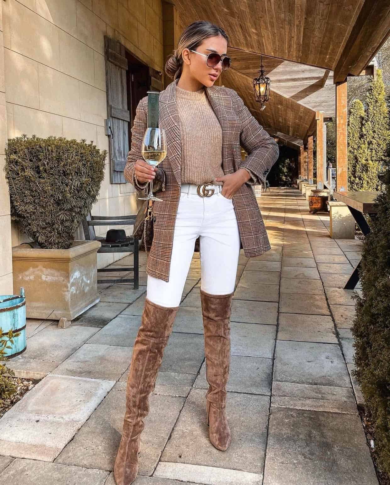 Elevate your autumn style with this sophisticated ensemble that perfectly balances cozy textures and sleek silhouettes. A plaid blazer in warm, earthy tones serves as the centerpiece, layered over a neutral ribbed sweater for added dimension. Crisp white jeans provide a fresh contrast, while the statement brown suede thigh-high boots elongate the legs and add a touch of drama. Accessorized with oversized sunglasses and a designer belt, this look exudes confidence and polish. It’s an ideal outfit for sipping wine on a crisp fall day, seamlessly transitioning from a casual vineyard tour to an upscale dinner reservation.