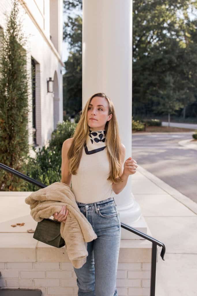 This autumn ensemble effortlessly blends casual comfort with chic sophistication. The sleeveless cream turtleneck serves as a versatile foundation, perfectly complemented by classic light-wash denim jeans. The outfit’s standout feature is the polka dot neck scarf, adding a playful pop of pattern and vintage charm. A plush beige coat, casually draped over the arm, provides warmth for cooler fall days while maintaining the outfit’s refined aesthetic. The look is completed with a structured dark handbag, striking the ideal balance between practicality and style. This ensemble showcases how simple pieces can be elevated to create a swoon-worthy fall look that’s both timeless and on-trend.