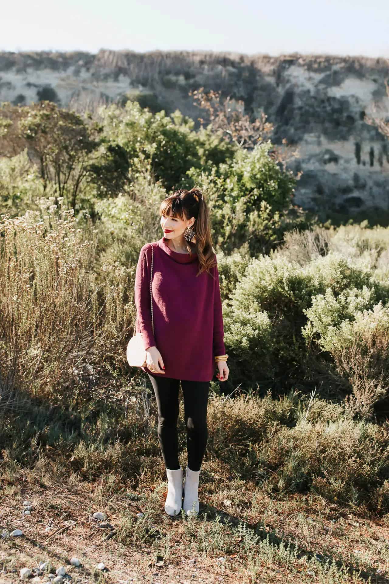 Embrace the crisp autumn air with this cozy yet chic ensemble perfect for outdoor explorations. The oversized burgundy sweater takes center stage, offering warmth and style in equal measure. Paired with sleek black leggings and eye-catching white ankle boots, this outfit strikes the ideal balance between comfort and fashion-forward flair. The rich burgundy hue complements the changing leaves, while statement earrings add a touch of glamour to the look. A small pink bag provides a playful pop of color, making this outfit versatile enough for both nature walks and casual outings. It’s a quintessential fall look that effortlessly combines practicality with seasonal charm.