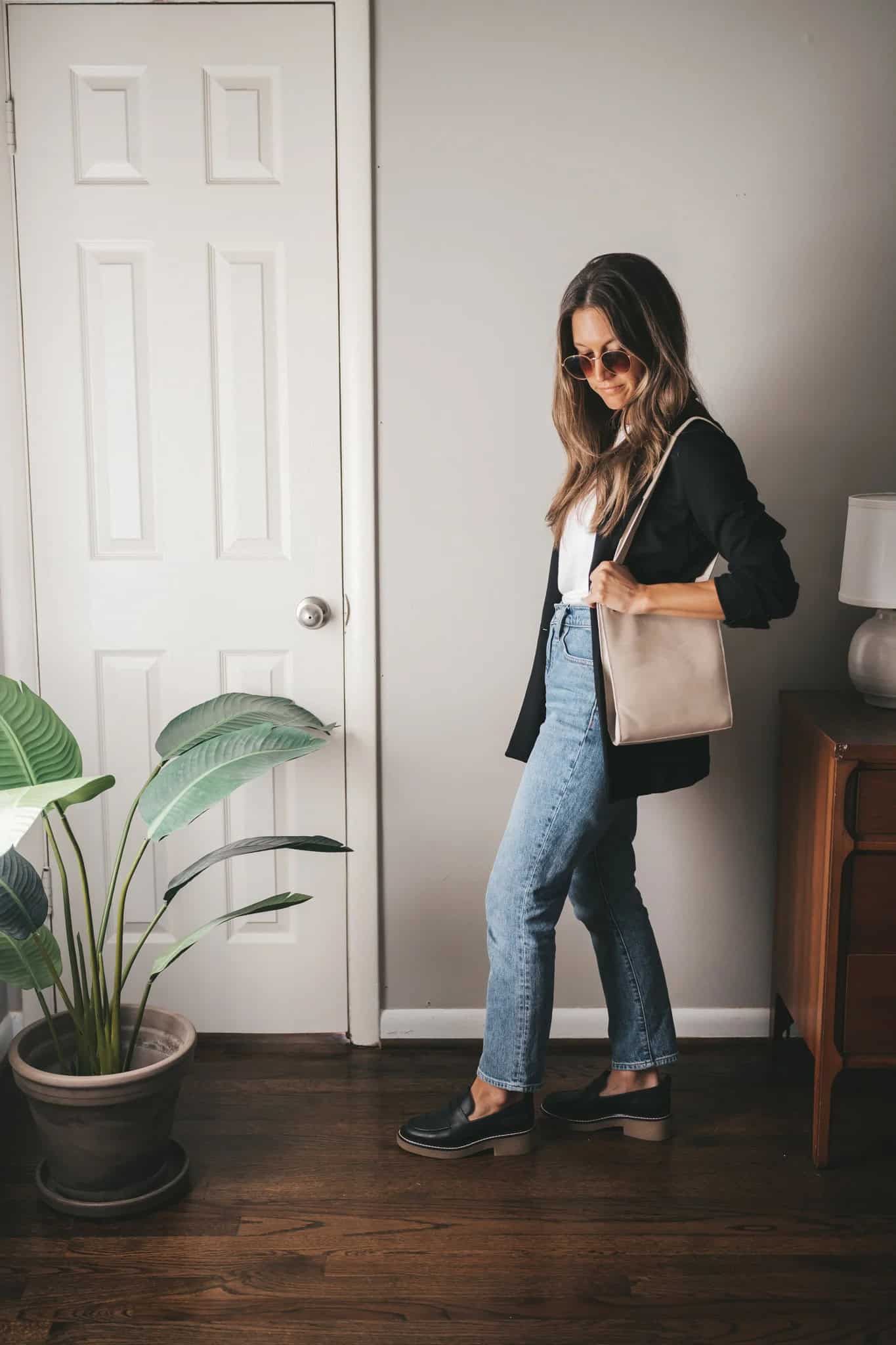 Embrace the perfect balance of casual and chic with this timeless fall ensemble. The sleek black blazer paired with light-wash denim jeans creates a sophisticated yet relaxed look that’s ideal for crisp autumn days. The white top underneath adds a fresh contrast, while the neutral tote bag complements the outfit’s minimalist appeal. Finished with stylish loafers and oversized sunglasses, this outfit exudes effortless cool. It’s a versatile choice that can easily transition from a day at the office to an evening out, making it a must-have for your fall wardrobe. The combination of textures and classic pieces demonstrates how simple elements can come together to create a truly swoon-worthy autumn style.