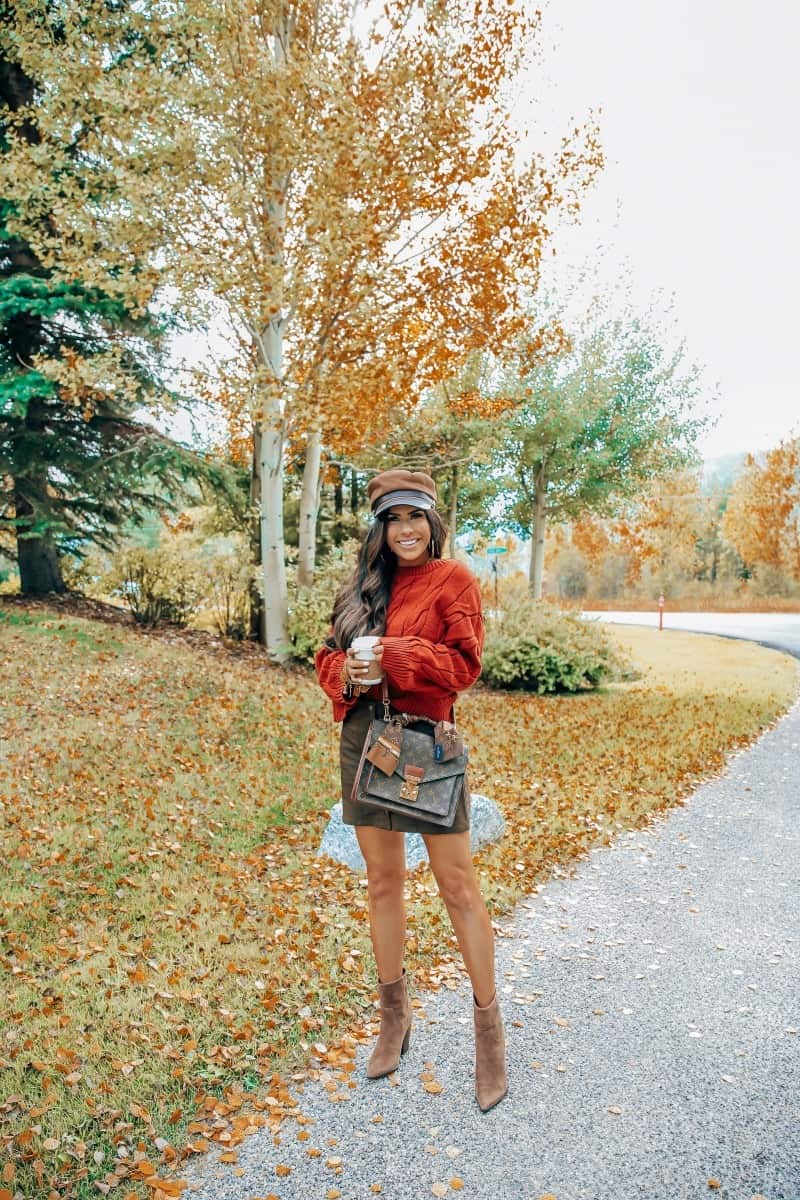 Embrace the essence of fall with this impeccably styled ensemble that perfectly captures the season’s warm palette. A cozy rust-colored cable knit sweater takes center stage, paired effortlessly with a brown suede mini skirt that strikes the ideal balance between comfort and sophistication. The look is elevated by sleek taupe ankle boots, adding a touch of urban flair to the autumnal aesthetic. A camel newsboy cap and a structured designer handbag complete this swoon-worthy outfit, showcasing how accessories can transform a casual look into a fashion-forward statement. Set against a backdrop of golden foliage, this ensemble embodies the epitome of fall chic, inspiring fashionistas to mix textures and rich, earthy tones for an unforgettable autumn style.