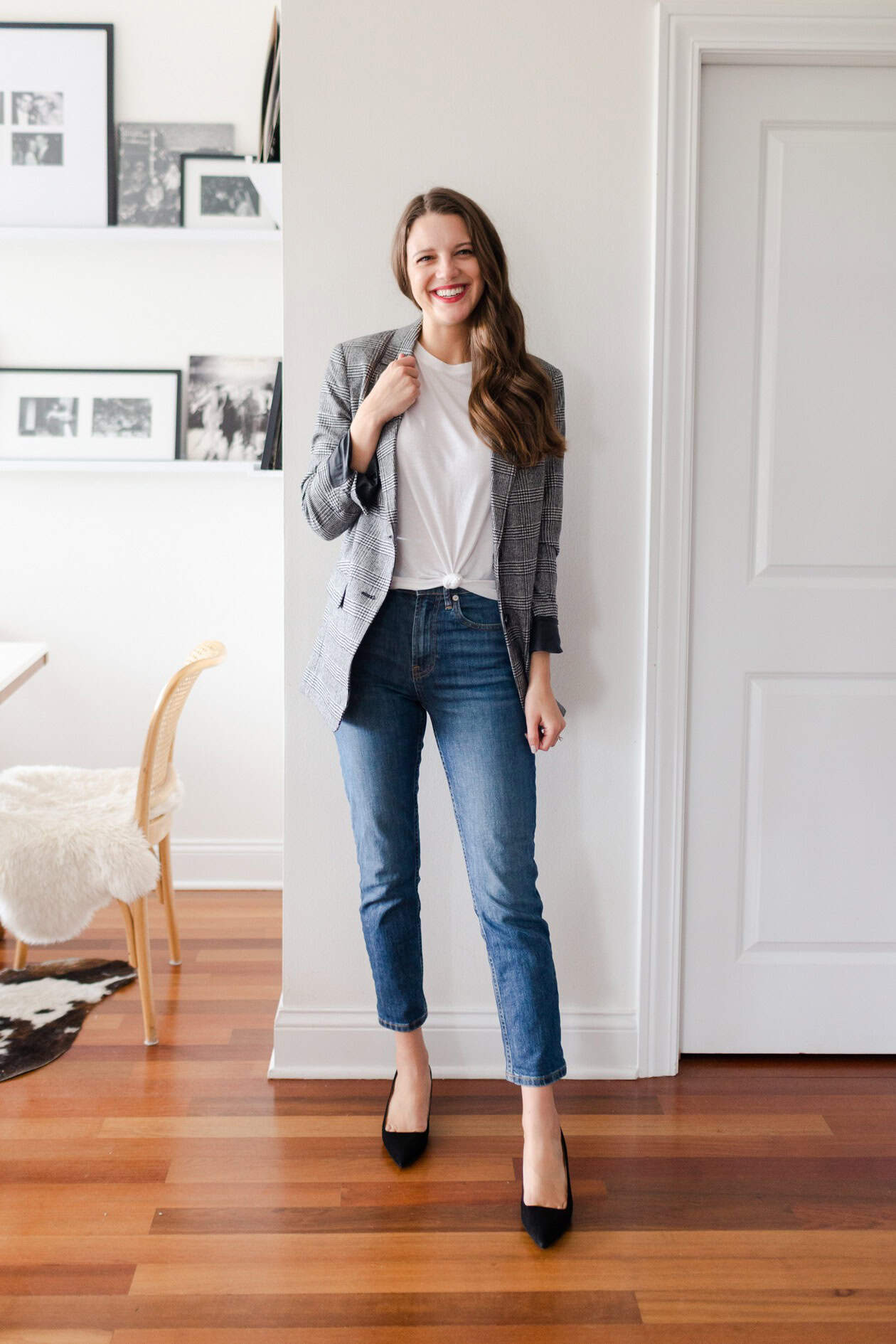 Elevate your autumn style with this effortlessly chic ensemble that combines classic pieces for a sophisticated yet casual look. The star of this outfit is the gray plaid blazer, a timeless fall staple that adds structure and polish to any ensemble. Paired with a crisp white t-shirt and well-fitted blue jeans, this look strikes the perfect balance between comfort and elegance. The knotted detail on the t-shirt adds a touch of playfulness, while black pointed-toe pumps elongate the silhouette and provide a sleek finish. This versatile outfit is perfect for transitioning from office to after-work drinks, embodying the essence of fall fashion with its blend of textures and autumnal hues.